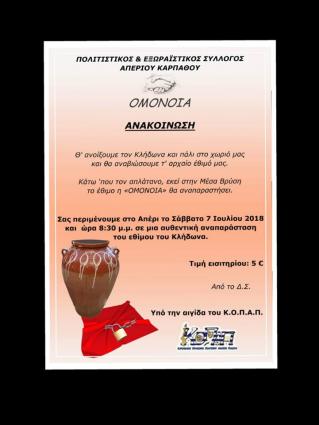 ΔΕΛΤΙΟ ΤΥΠΟΥ-Θέμα: "Αναπαράσταση του Κλήδονα από την "ΟΜΟΝΟΙΑ" Απερίου"