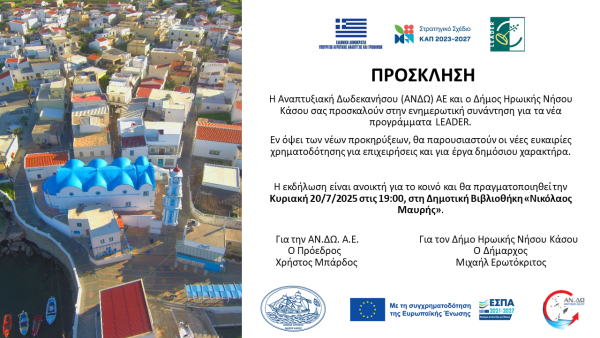 Η Αναπτυξιακή Δωδεκανήσου (ΑΝΔΩ) ΑΕ και ο Δήμος Ηρωικής Νήσου Κάσου σας προσκαλούν στην ενημερωτική συνάντηση για τα νέα προγράμματα LEADER.