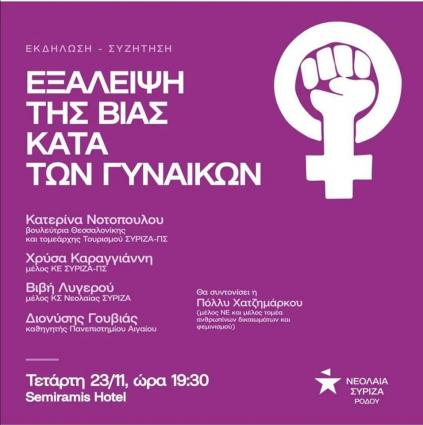 Η Νεολαία Σύριζα Ρόδου σας προσκαλεί στην εκδήλωση που θα πραγματοποιήσει την Τετάρτη 23 Νοεμβρίου με θέμα «ΕΞΑΛΕΙΨΗ ΤΗΣ ΒΙΑΣ ΚΑΤΑ ΤΩΝ ΓΥΝΑΙΚΩΝ» στο ...