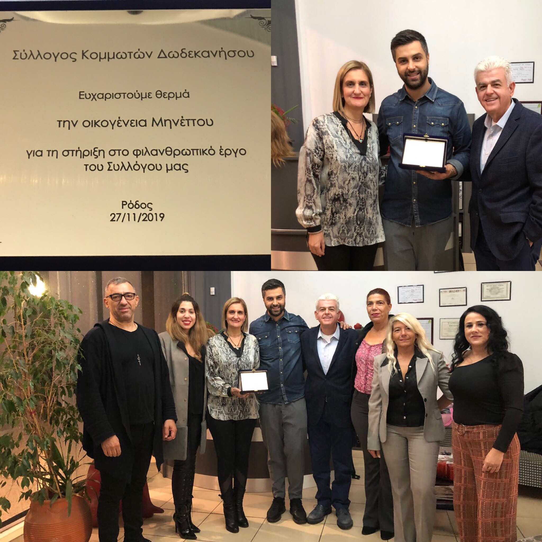 -Ο Σύλλογος Καταστηματαρχών Κομμωτών Κουρέων Δωδεκανήσου, ευχαριστεί θερμά την οικογένεια Μηνέττου και την ξενοδοχειακή τουριστική και εμπορική εταιρεία ΙΩΑΝΝΗΣ ΜΗΝΕΤΤΟΣ ΑΕ για την γενναιόδωρη προσφορά του στο Σύλλογο μας στηρίζοντας την εθελοντική δράση <ΔΩΡΕΑ ΜΑΛΛΙΩΝ ΔΩΔΕΚΑΝΗΣΟΥ> με μοναδικό σκοπό την κατασκευή περουκών, για να δοθούν σε γυναίκες που νοσούν από καρκίνο.