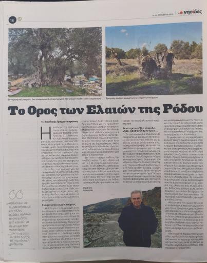 Η αγωνία του εκδηλώνεται με αγώνα για την ενημέρωση της τοπικής κοινωνίας για την ανάγκη να προστατευθούν αυτά τα ιστορικά ελαιόδεντρα και οδηγεί την οργάνωση στη δημιουργία του, « Πρώτου Πάρκου Φυσικής Βλάστησης Υπεραιωνόβιων Ελαιόδεντρων» στη Ρόδο και στην Ελλάδα.