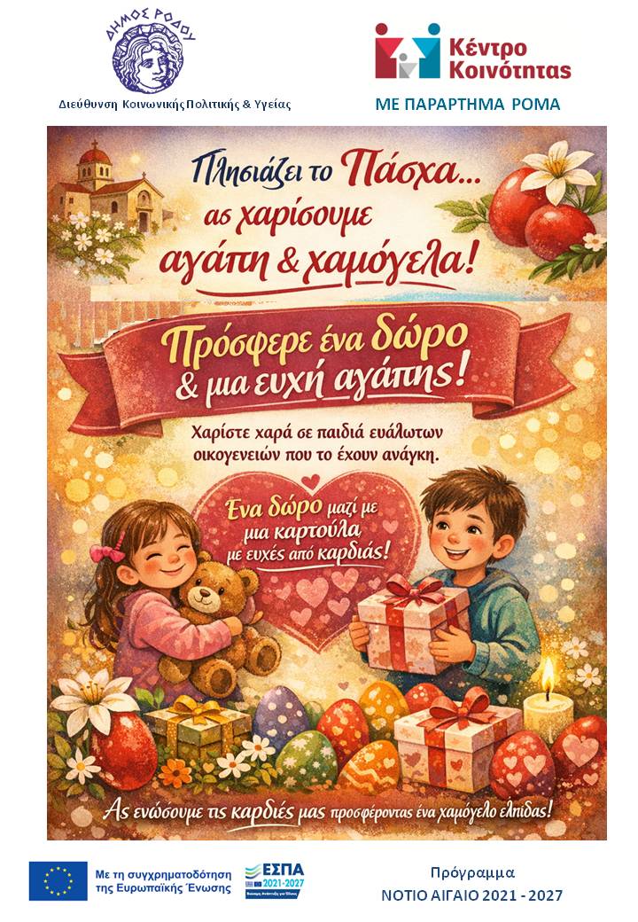 Ας κάνουμε αυτό το Πάσχα πιο φωτεινό για όλους. Η συγκέντρωση δώρων θα πραγματοποιείται στα γραφεία του Κέντρου Κοινότητας με Παράρτημα Ρομά Δήμου Ρόδου (Ερυθρού Σταυρού 12, εντός παλαιού νοσοκομείου)
