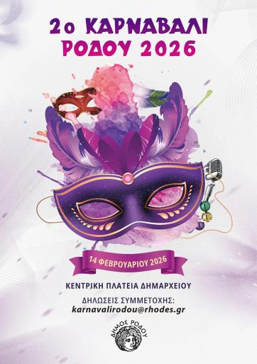 Ο Δήμος Ρόδου ανακοινώνει με ιδιαίτερη χαρά την πραγματοποίηση του 2ου Καρναβαλιού Ρόδου, το οποίο θα διεξαχθεί το Σάββατο 14 Φεβρουαρίου 2026, μετά την τεράστια επιτυχία και τη μεγάλη συμμετοχή που σημείωσε η περσινή διοργάνωση.