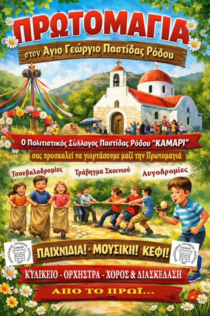 Παστίδα, Ρόδος – Ο Πολιτιστικός Σύλλογος Παστίδας «ΚΑΜΑΡΙ» προσκαλεί μικρούς και μεγάλους να γιορτάσουμε μαζί την Άνοιξη, την Παρασκευή 1η Μαΐου 2026, στον μαγευτικό χώρο του παρεκκλησίου του Άη Γιώργη στην Παστίδα.