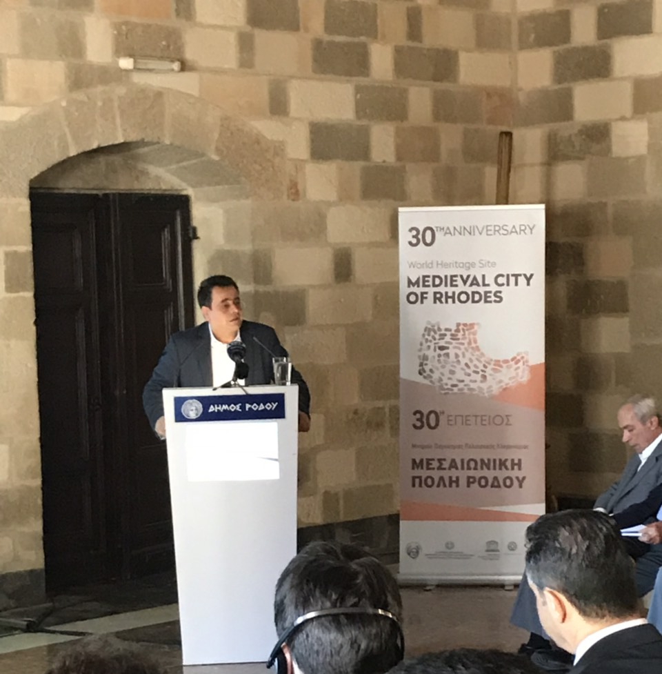 30 χρόνια μετά την ένταξη της Μεσαιωνικής Πόλης της Ρόδου, στον κατάλογο Μνημείων της UNESCO, το Σάββατο 3 Νοεμβρίου υπεγράφη στη Ρόδο, Μνημόνιο Συνεργασίας μεταξύ του Υπουργείου Πολιτισμού, του Υπουργείου Ναυτιλίας και Νησιωτικής Πολιτικής, της Περιφέρειας Νοτίου Αιγαίου και του Δήμου Ρόδου, ως προπομπός για την Σύνταξη Προγραμματικής Σύμβασης. Ο Αναπληρωτής Υπουργός Ναυτιλίας και Νησιωτικής Πολιτικής, Νεκτάριος Σαντορινιός, χαιρετίζοντας στην εκδήλωση και πριν την υπογραφή του Μνημονίου, ανέφερε: «Η ένταξη της Μεσαιωνικής Πόλης της Ρόδου στον κατάλογο των Μνημείων της UNESCO, 30 χρόνια πριν, αποτέλεσε μια σημαντική ιστορική στιγμή για το νησί. Το γεγονός ότι ήταν η πρώτη ελληνική πόλη που εντάχθηκε, τότε, κάτω από την προστασία του Διεθνούς αυτού Οργανισμού, καταδεικνύει το μέγεθος και τη σημασία του Μνημείου, όχι μόνο για την Ελληνική, όσο και για την Παγκόσμια πολιτιστική κληρονομιά. Αποτελεί μνημείο και απόδειξη της γεωπολιτικής θέσης του νησιού, ένα ζωντανό σταυροδρόμι πολιτισμών, φέροντας ανάγλυφα τα σημάδια όσων πέρασαν από εδώ: Οθωμανοί, Εβραίοι, Άραβες, Ιππότες και φυσικά Έλληνες άφησαν το στίγμα τους στη ζωή της πόλης. Η Μεσαιωνική Πόλη της Ρόδου, αναμφισβήτητα είναι μοναδική, αφού από τη μια διατηρεί, σχεδόν αναλλοίωτο, τον ιστό της, τα τείχη και τα οχυρωματικά έργα γύρω από αυτήν, και από την άλλη, είναι ενεργή από τον καιρό της ίδρυσής της, μέχρι σήμερα, στοιχείο που απαντάται σε λίγες ακόμη μεσαιωνικές Ευρωπαϊκές πόλεις. Γιορτάζοντας σήμερα το παρελθόν και το μέλλον της Μεσαιωνική Πόλης του νησιού μας, δεν μπορώ να μην αναφέρω πως ο δρόμος μέχρι την ημέρα κήρυξής της ως μνημείο παγκόσμιας κληρονομιάς- την 9η Δεκεμβρίου 1988- δεν ήταν εύκολος. Δεν έγινε τίποτα μαγικά.Για να φτάσουμε σε εκείνη την σημαδιακή μέρα, είχαν προηγηθεί προσπάθειες πολλών ανθρώπων, φωτισμένων ανθρώπων, που σήμερα κάποιοι από αυτούς είναι εδώ:ο Σάββας Καραγιάννης, που κυνηγούσε την Μελίνα Μερκούρη για να γίνει η πρώτη προγραμματική σύμβαση για την διατήρηση της Μεσαιωνικής πόλης, ο Μάνος Κόκκινος, ο Γιώργος Γιαννόπουλος- ο μόνος Έλληνας Πρόεδρος του Οργανισμού Πόλεων Παγκόσμιας Πολιτιστικής Κληρονομιάς-, ο Γιάννης Μαχαιρίδης,και πολλοί άλλοιπου έδωσαν τον εαυτό τους και από τους οποίους σήμερα εμείς παίρνουμε το νήμα. Δίπλα τους στάθηκαν σημαντικοί αρχαιολόγοι και μηχανικοί, όπως οι δυο μεγάλοι απόντες, ο Ηλίας Κόλλιας και ο Θανάσης Αναπολιτάνος οι οποίοι ανέδειξαν την παλιά πόλη των φαντασμάτων, της δεκαετίας του 80, στην λαμπερή Μεσαιωνική Πόλη που είναι σήμερα. Σε αυτό το σημείο, θα ήθελα να μου επιτρέψετε μια προσωπική αναφορά:Από το 1998 μέχρι το 2014, ανήκοντας στο δυναμικό της υπηρεσίας προγραμματισμού, συνεργάστηκα με πολλούς από εσάς εδώ- σημαντικούς αρχαιολόγους, μηχανικούς, ανθρώπους της πολιτικής, που έδειξαν διορατικότητα και λειτούργησαν προωθητικά στην υπόθεση της Μεσαιωνικής Πόλης. Είμαι ιδιαίτερα περήφανος για αυτές τις συνεργασίες, για το λιθαράκι που έβαλα και εγώ τότε, και ελπίζω και από τον σημερινό που ρόλο να προσφέρω και πάλι στην Μεσαιωνική Πόλη. Μέσα σε όλα αυτά τα χρόνια που ίσχυε η πρώτη Προγραμματική Σύμβαση, έγιναν πολλά έργα, όπως αποκαταστάσεις καταλυμάτων, αναπλάσεις κοινοχρήστων χώρων, αποκαταστάσεις μνημείων και κατοικιών, συντήρηση των τειχών και των υπογείων δικτύων, τα οποία κράτησαν πάνω από 14 χρόνια και ξοδεύτηκ