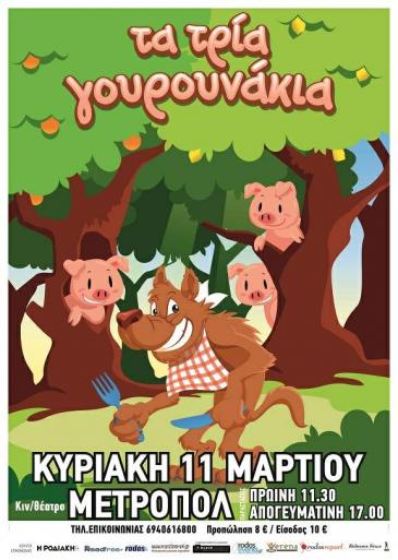 «Τα τρία γουρουνάκια»-Η πιο διαδραστική παιδική παράσταση έρχεται στη Ρόδο! -Θέλεις να βοηθήσεις τα γουρουνάκια να γλιτώσουν από τον λύκο; Θέλεις να μπεις και εσύ στο παιχνίδι και να πρωταγωνιστήσεις στην πιο διασκεδαστική παιδική παράσταση και του φετινού χειμώνα; Αν ναι, πάρε τη μαμά σου το μπαμπά σου και τους φίλους σου και έλα στο κινηματοθέατρο «ΜΕΤΡΟΠΟΛ» όχι μόνο για να δεις αλλά και να παίξεις στα «Τρία Γουρουνάκια». Μια διαδραστική παράσταση που οι μικροί θεατές ζουν το παραμύθι μέσα από το ίδιο το παραμύθι. Βοηθούν τα γουρουνάκια να γλιτώσουν από τον κακό λύκο, τραγουδούν και χορεύουν με τους ηθοποιούς, φτιάχνουν τη δική τους ιστορία και πρωταγωνιστούν μέσα σ’ αυτή.