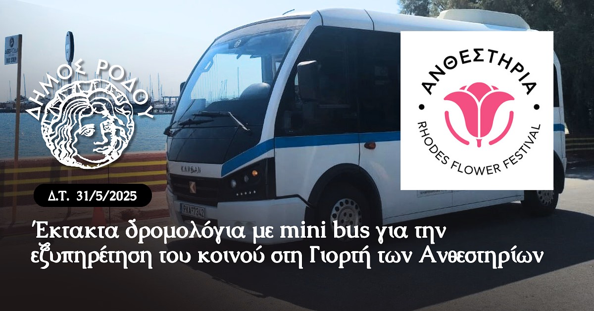 Ο Δήμος Ρόδου ενημερώνει ότι, με αφορμή τη Γιορτή των Ανθεστηρίων την Κυριακή 1 Ιουνίου, θα πραγματοποιηθούν έκτακτα δωρεάν δρομολόγιααπό τη Δημοτική Συγκοινωνία μεminibus για την καλύτερη εξυπηρέτηση των πολιτών.
