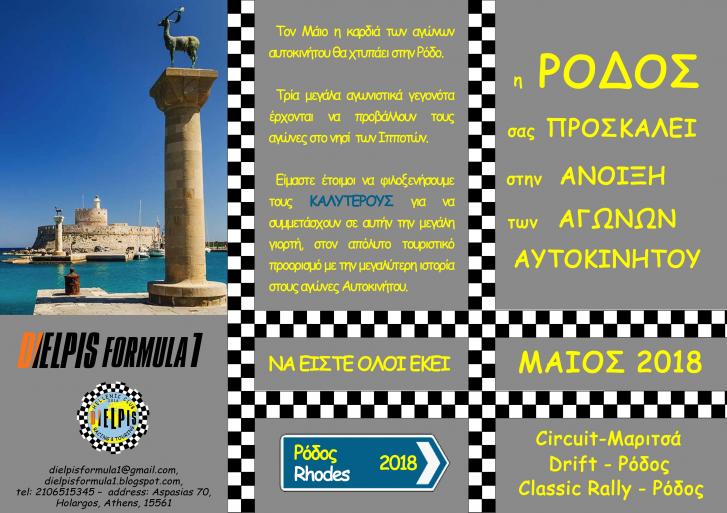 ΔΕΛΤΙΟ ΤΥΠΟΥ-Η Ρόδος, το νησί των Ιπποτών ετοιμάζει και ετοιμάζεται για μια ξεχωριστή Άνοιξη του μηχανοκίνητου αθλητισμού, όπως παλιά, στις αρχές Μαΐου. -Αυλαία με αγώνα ταχύτητας αυτοκινήτων στο αεροδρόμιο των Μαριτσών στις 5-6 Μαΐου και παράλληλες εκδηλώσεις στην Παλαιά Πόλη της Ρόδου, με θεαματικό αγώνα DRIFT και αγώνα REGIOULARITE παλαιών ιστορικών αυτοκίνητων, σε εντυπωσιακές ειδικές διαδρομές. Συνδεδεμένη ιστορικά με τον κόσμο των τροχών - από την δεκαετία του 50- η Ρόδος, δίνει ειδικό βάρος στην εφετινή Τουριστική Άνοιξη με αφορμή την αναβίωση των αυτοκινητικών αγώνων. Αθλητισμός, Πολιτισμός και εξειδικευμένα στοχευμένος Τουρισμός με φόντο και τερέν το σμαραγδένιο νησί, ήταν πάντα το επιθυμητό ζητούμενο. Ένα ανέλπιστο συμβάν, σκιάζε την προβολή της πάντα κοσμοπολίτικης Ρόδου, το τραγικό ατύχημα (1971) που στέρησε την ζωή του Γιάννη -ΜΑΥΡΟΥ-Μεϊμαρίδη... Σ’ αυτόν τον αείμνηστο υπέροχο σπόρτσμαν και άνθρωπο, είναι αφιερωμένος ο αγώνας και ολόκληρη η προσπάθεια αναβίωσης των αγώνων ταχύτητας, υπό την εποπτεία της ΟΜΑΕ, της START LINE και της DIELPIS περί αγώνων. Ο αγώνας φέτος, μπορεί να μην δίνεται μέσα στα τείχη της Παλαιάς Πόλης, αλλά στα Μαριτσά, για λόγους ασφαλείας. Φιλοδοξεί όμως, βάσιμα, να επιλυθούν κάποια προβλήματα και να αναβιώσει με την παλαιά μορφή (Όπως δίνει ήδη η F1 - και άλλες μορφές αγώνων - ουκ ολίγα παραδείγματα παγκοσμίως). Οι φορείς του νησιού, οι αγωνιζόμενοι και η νεολαία, έχουν ήδη αγκαλιάσει με θέρμη, την μηχανοκίνητα άνοιξη και ευελπιστούν σε διεθνείς συμμετοχές, στο μέλλον, για να ξαναπιαστεί το νήμα του ιστορικού αγώνα.