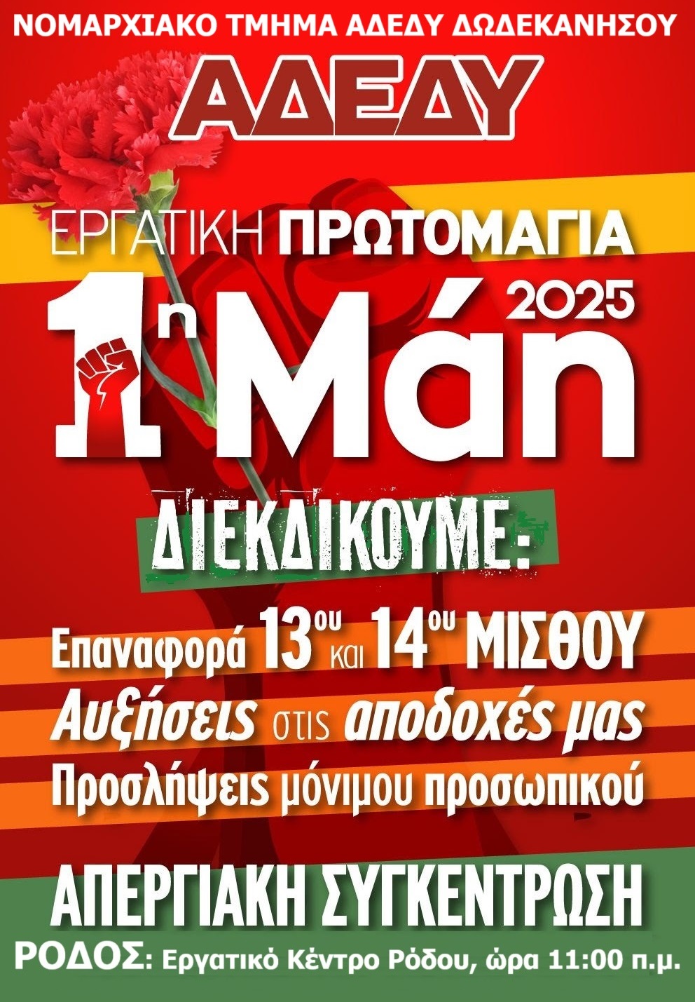 Η Εκτελεστική Γραμματεία του Νομαρχιακού Τμήματος Α.Δ.Ε.Δ.Υ. Δωδεκανήσου καλεί τους εργαζόμενους στο Δημόσιο να δώσουν δυναμικά το παρών στην απεργία και στην απεργιακή συγκέντρωση που θα γίνει την Πέμπτη 1η Μαΐου 2025, στο Εργατικό Κέντρο Ρόδου, ώρα 11:00 π.μ.