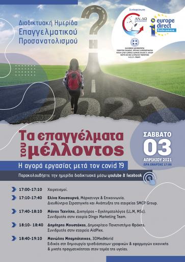 Το Τμήμα Επαγγελματικού Προσανατολισμού του ΚΕΣΥ Ρόδου, το Κέντρο Ευρωπαϊκής Πληροφόρησης Δωδεκανήσου της ΑΝ.ΔΩ Α.Ε, η Συντονίστρια Εκπαιδευτικού Έργου Φιλολόγων του 2ου Περιφερειακού Κέντρου Εκπαιδευτικού Σχεδιασμού Ν. Αιγαίου, συνδιοργανώνουν Διαδικτυακή Ημερίδα Επαγγελματικού Προσανατολισμού με θέμα: