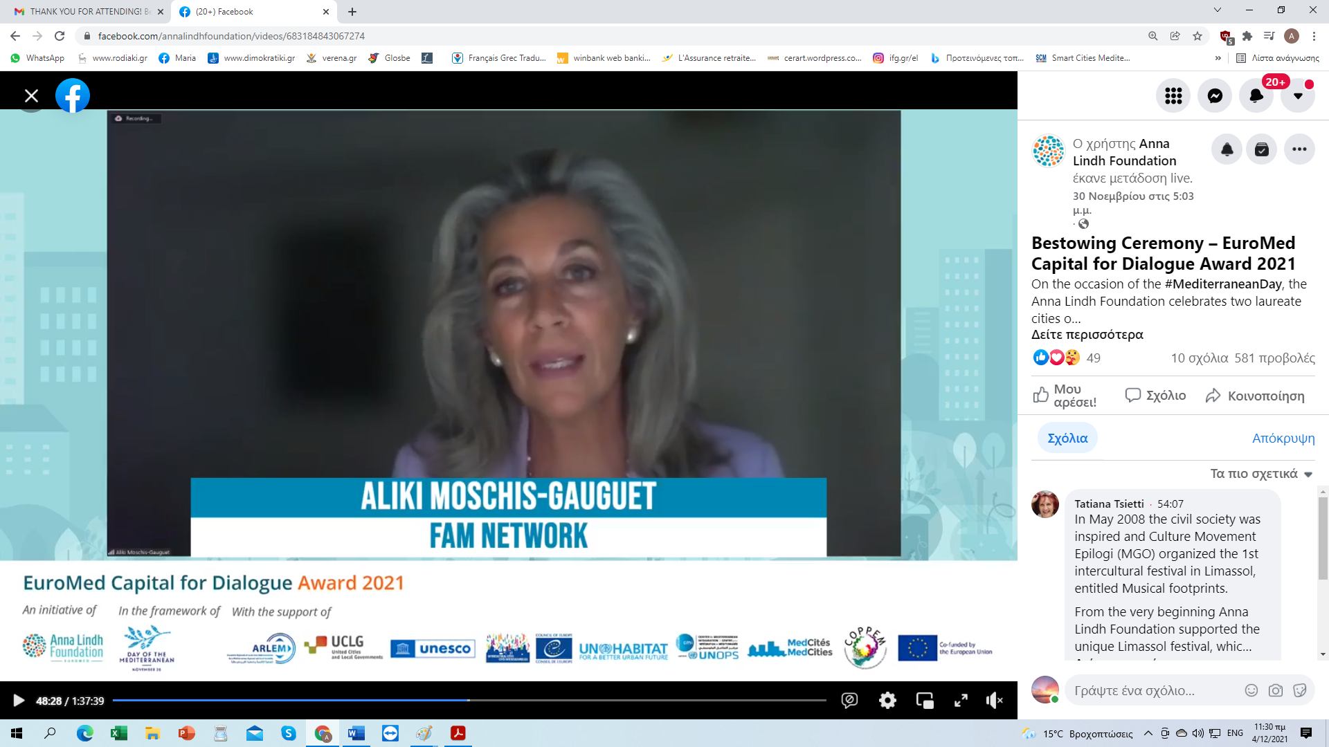 Η Αλίκη Μοσχή ήταν επίσης ομιλήτρια σε στρογγυλή τράπεζα που ακολούθησε την τελετή βράβευσης, με θέμα «Προκλήσεις και ευκαιρίες που προκύπτουν από την κλιματική κρίση και την πανδημία της Covid 1, για την προώθηση του διαπολιτισμικού διαλόγου στην Ευρωμεσογειακή ζώνη. Προτάσεις για τη στήριξη του κοινωνικού και πολιτισμικού διαλόγου σε τοπικό επίπεδο».