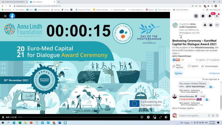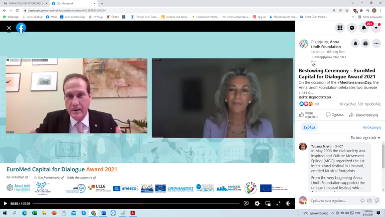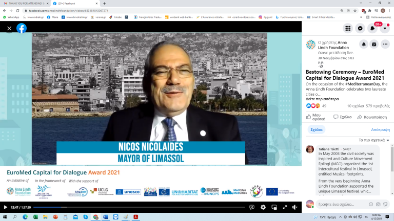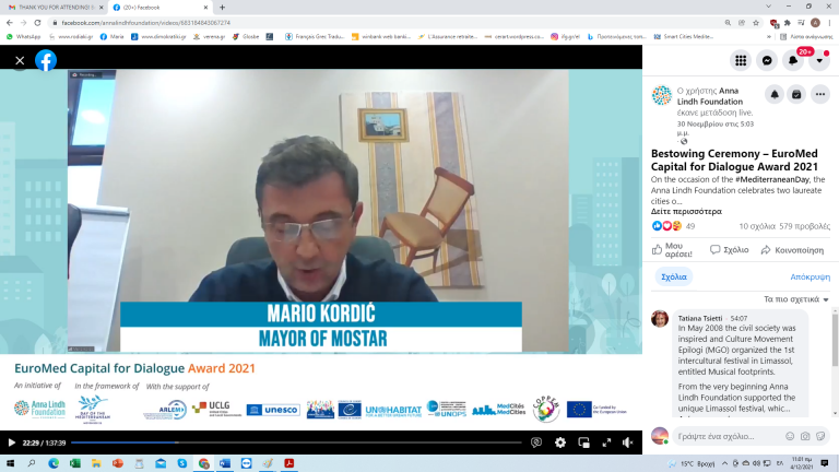 Τον τίτλο της «Ευρωμεσογειακής Πρωτεύουσας Διαλόγου» έλαβαν η πόλη της Λεμεσού της Κύπρου και η πόλη Μόσταρ της Βοσνίας – Ερζεγοβίνης και η επίσημη απονομή του 1ου Βραβείου πραγματοποιήθηκε διαδικτυακά την Τρίτη 30 Νοεμβρίου 2021. Συμμετείχαν εκπρόσωποι όλων των εμπλεκομένων φορέων ενώ μεταδόθηκε σε lifestreaming -διαδικτυακα.