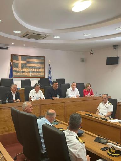 Ακολούθησε σύσκεψη στο Δημαρχείο Κω, όπου, παρουσία του Βουλευτή Δωδεκανήσου Ιωάννη Παππά, της Επάρχου Κω, Κωνσταντίνας Σβύνου, του Δημάρχου Κω, Θεοδόση Νικηταρά, του Διοικητή 80 ΑΔΤΕ, Ταξιάρχου Δημητρίου Κουλέτση και του Αστυνομικού Διευθυντή Β Δωδεκανήσου, Υποστρατήγου ΕΛ.ΑΣ. Ηλία Βαζούρα, συζητήθηκαν θέματα και ζητήματα που αφορούν στην τοπική κοινωνία, στις ανάγκες και στις υποδομές του νησιού.