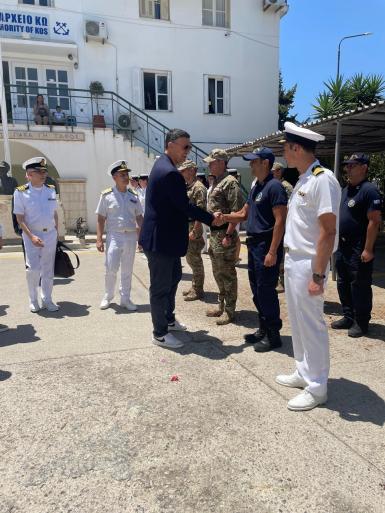 Τον Υπουργό, ο οποίος συνοδευόταν από τον Β' Υπαρχηγό του Λ.Σ – ΕΛ.ΑΚΤ., Υποναύαρχο Λ.Σ. Φώτιο Κιάμο, υποδέχθηκαν ο Διοικητής της 8ης Περιφερειακής Διοίκησης Λ.Σ. – ΕΛ.ΑΚΤ., Πλοίαρχος Λ.Σ. Δημήτριος Ζαραζάνης, ο Λιμενάρχης του Λιμεναρχείου Κω, Πλοίαρχος Λ.Σ. Ιωάννης Μάργαρης και ο Πρόεδρος της Μαρίνας Κω, Ιωάννης Καλλέργης, με τους οποίους μετέβη, αρχικά, για επιθεώρηση στα περιπολικά σκάφη του Λ.Σ-ΕΛ.ΑΚΤ. που ελλιμενίζονται στη Μαρίνα. Εκεί, συνεχάρη τα πληρώματα για την διαρκή ετοιμότητα, τον επαγγελματισμό και την αυταπάρνηση που επιδεικνύουν καθημερινά, με γνώμονα την προστασία της ανθρώπινης ζωής στη θάλασσα και την προάσπιση των θαλασσίων συνόρων της πατρίδας.