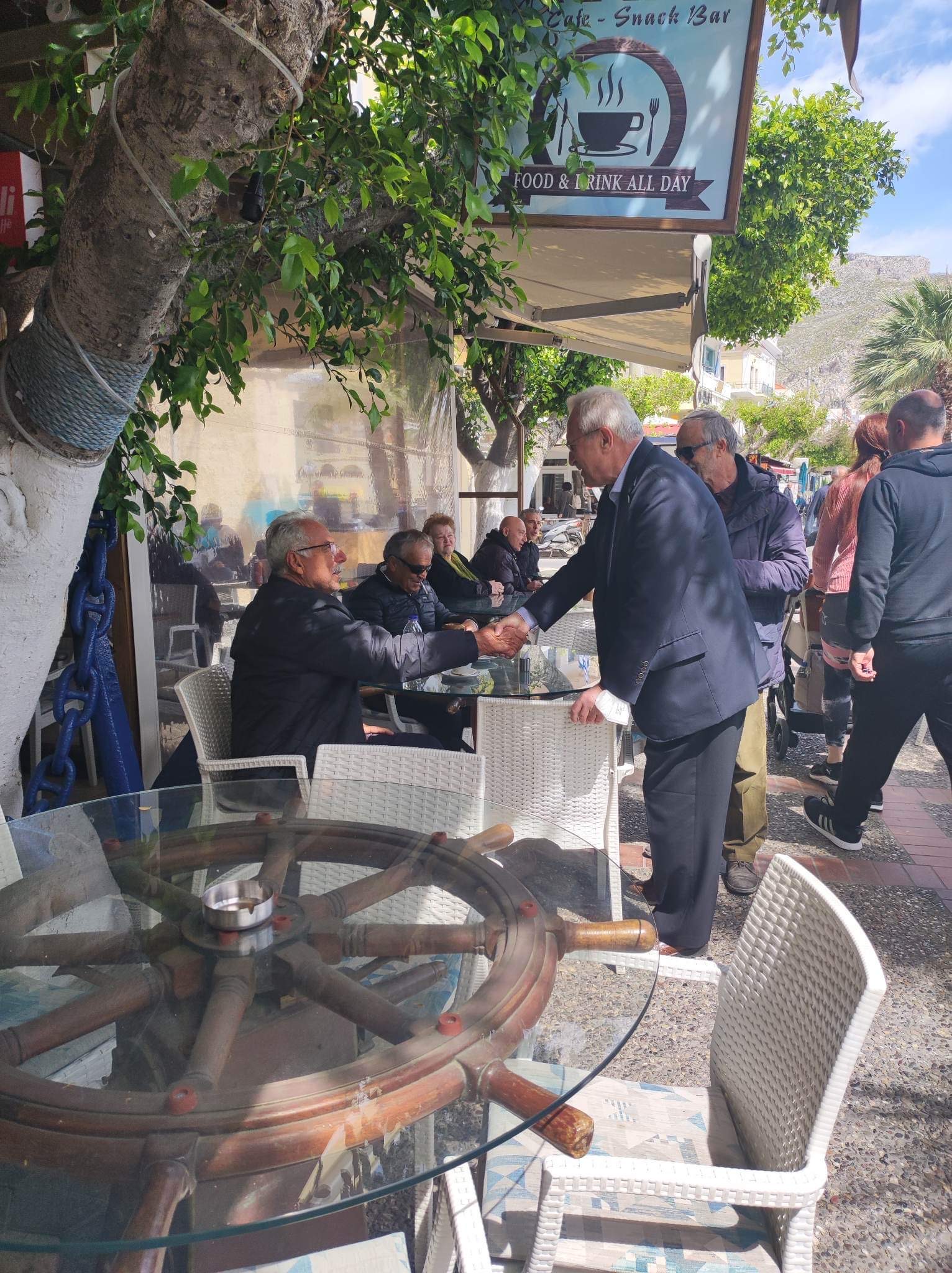 Νωρίτερα είχε την ευκαιρία να συναντήσει μέλη της Ο.Μ. Καλύμνου και του συντονιστικού, στη συνέχεια έκανε βόλτα στην κεντρική πλατεία του νησιού, όπου ήλθε σε επαφή με πάρα πολλούς Καλύμνιους και άκουσε με πολύ προσοχή και ιδιαίτερο ενδιαφέρον τα θέματα που τους απασχολούν καθώς και τους προβληματισμούς, που εκείνοι του έθεσαν.
