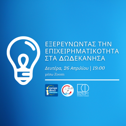 διοργανώνεται την Μ. Δευτέρα και ώρα 19:00 από το κέντρο Ευρωπαϊκής πληροφόρησης της ΑΝ.ΔΩ Α.Ε και τον οργανισμό Bizrupt. Πρόκειται για μια online συνάντηση με στόχο να συζητηθούν ευκαιρίες αλλά και να εξερευνηθούν επιχειρηματικές ιδέες, με εισηγητές δύο νέους τοπικούς επιχειρηματίες που θα μας μιλήσουν για το δικό τους ταξίδι. Πρόκειται για τον Μανόλη Μακρή, Founder της Pixel Data και τον Ραφαήλ Κουδούνη, Διευθύνοντα Σύμβουλο της Dingo Marketing Team, αμφότεροι με καταγωγή από τα Δωδεκάνησα.