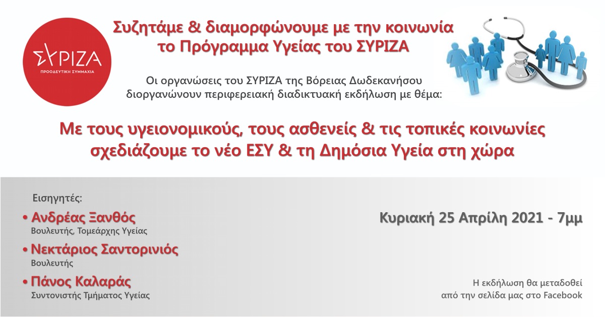 - Η ΝΕ ΣΥΡΙΖΑ - ΠΣ Βόρειας Δωδεκανήσου διοργανώνει διαδικτυακή εκδήλωση - συζήτηση, την Κυριακή 25 Απριλίου, στις 7.00 μ.μ., για το Πρόγραμμα Υγείας του ΣΥΡΙΖΑ - Προοδευτική Συμμαχία με θέμα: