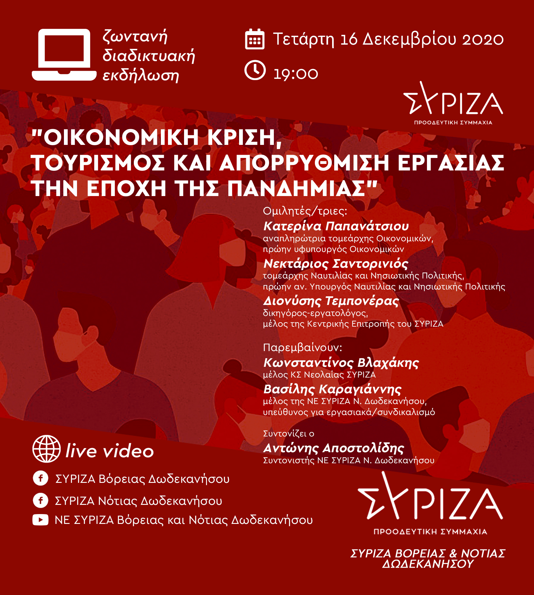 - Διαδικτυακή εκδήλωση των Νομαρχιακών ΣΥΡΙΖΑ-ΠΣ Δωδεκανήσου - Με θέμα "Οικονομική κρίση, τουρισμός και απορρύθμιση εργασίας στην εποχή της πανδημίας"