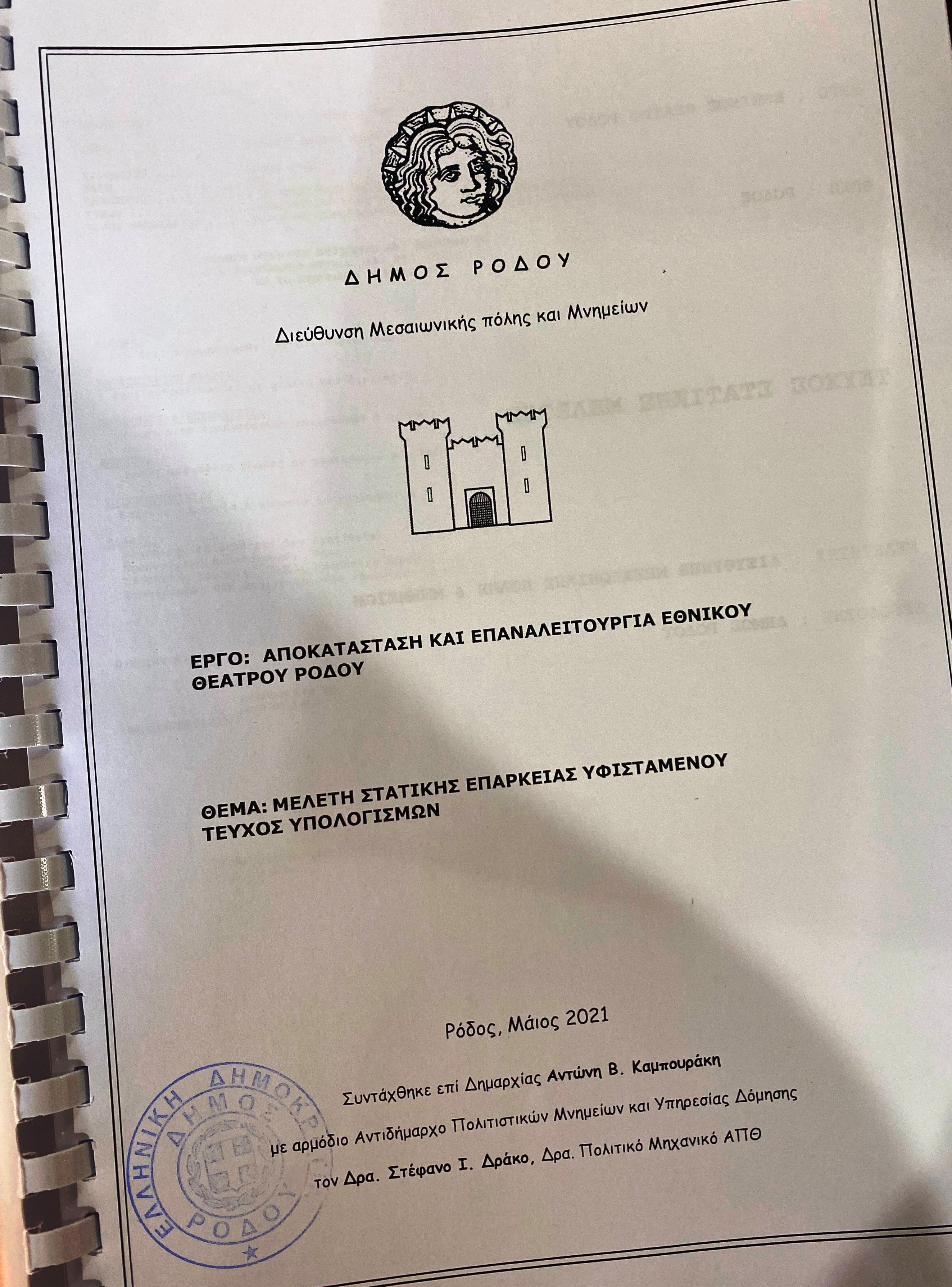 Συγκεκριμένα, ο αντιδήμαρχος Πολιτιστικών Μνημείων και Υπηρεσίας Δόμησης Δρ. Στέφανος Ι. Δράκος και η Διεύθυνση Μεσαιωνικής πόλης και Μνημείων, υπέβαλαν στο Υπουργείο Πολιτισμού διακόσια είκοσι δύο (222) αρχεία σε ηλεκτρονική μορφή και δεκαέξι (16) κιβώτια σε έντυπη, θεωρημένα και υπογεγραμμένα. Τα αρχεία, περιλαμβάνουν τις μελέτες, τις προδιαγραφές μελετών εφαρμογής και τα τεύχη για τη δημοπράτηση του έργου: «Αποκατάσταση και επαναλειτουργία Εθνικού Θεάτρου Ρόδου», σε εφαρμογή της ιστορικής δέσμευσης του Πρωθυπουργού Κυριάκου Μητσοτάκη, την 5η Νοεμβρίου 2021, από τη Ρόδο, συνοδευόμενος από την Υπουργό Πολιτισμού Λίνα Μενδώνη, για τη χρηματοδότηση του έργου από το Υπουργείο Πολιτισμού.