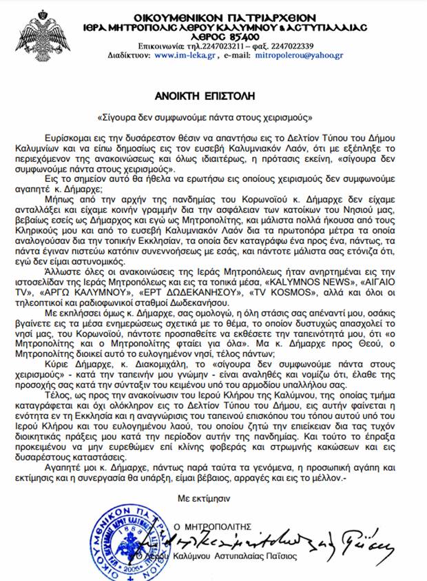 Ρεπορτάζ απο τον "ΠΑΛΜΟ ΚΑΛΥΜΝΟΥ: Άμεση ήταν η αντίδραση του Μητροπολίτη κ.κ. Παϊσίου, στο χθεσινό δελτίο τύπου του Δημάρχου, ο οποίος με "Ανοικτή Επιστολή" απαντά στον Δημήτρη Διακομιχάλη, επισημαίνοντας πως με τις δηλώσεις του προσπαθεί να τον "εκθέσει", σε σχέση με την διαχείριση της πανδημίας και τονίζει με ιδιαίτερη έμφαση πως "Μα κ. Δήμαρχε προς Θεού, ο Μητροπολίτης διοικεί αυτό το ευλογημένον νησί, τέλος πάντων;"