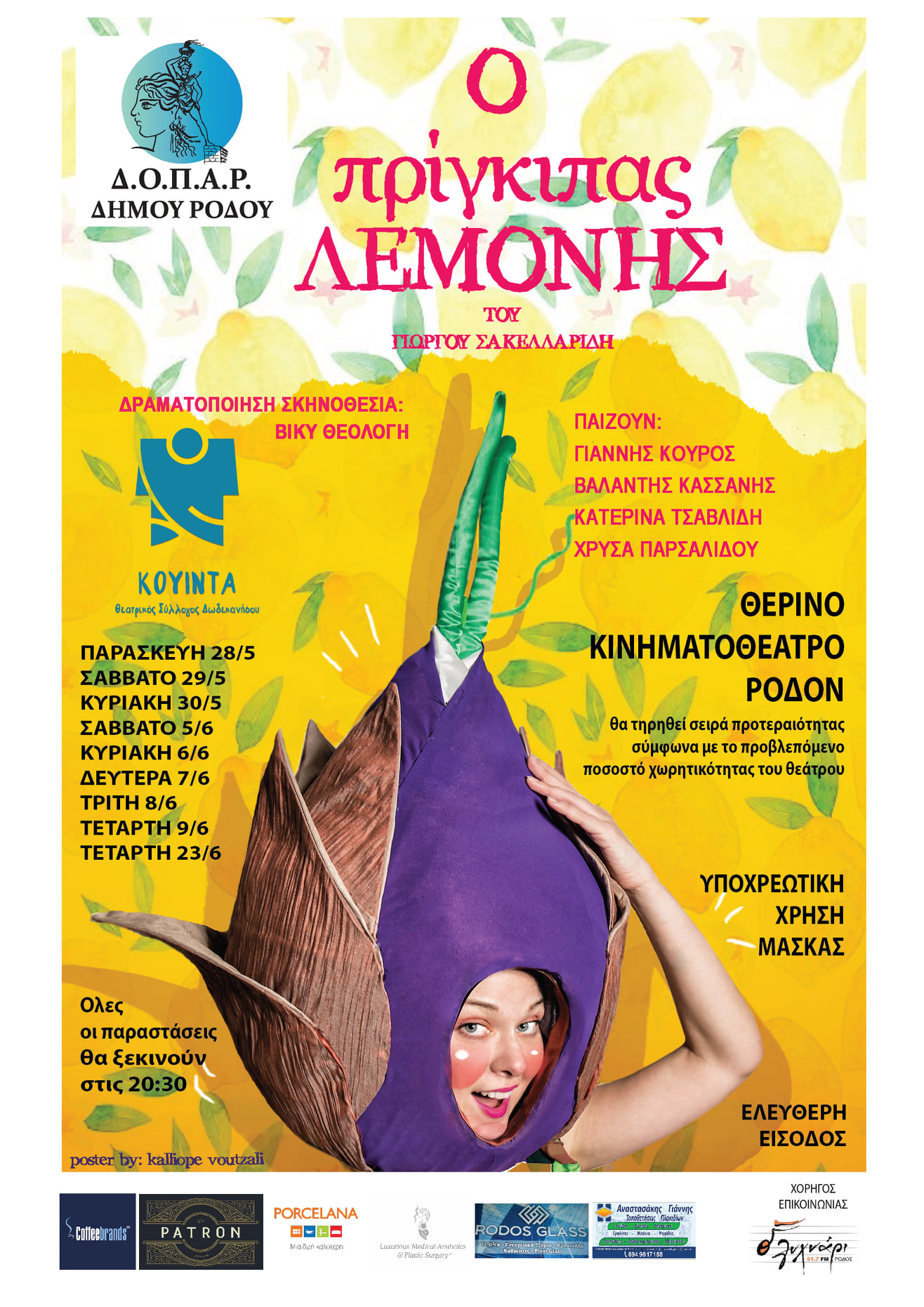 Ο πολυαγαπημένος σε μικρούς και μεγάλους "ΠΡΙΓΚΙΠΑΣ ΛΕΜΟΝΗΣ" του Γιώργου Σακελλαρίδη σε δραματοποίηση και σκηνοθεσία της Βίκυς Θεολόγη παρουσιάζεται στο κινηματοθέατρο ΡΟΔΟΝ στις 28,29, 30 Μαΐου και 5,6,7,8,9 και 23 Ιουνίου σε μία συνδιοργάνωση του ΔΟΠΑΡ και του Θεατρικού Συλλόγου Δωδεκανήσου.