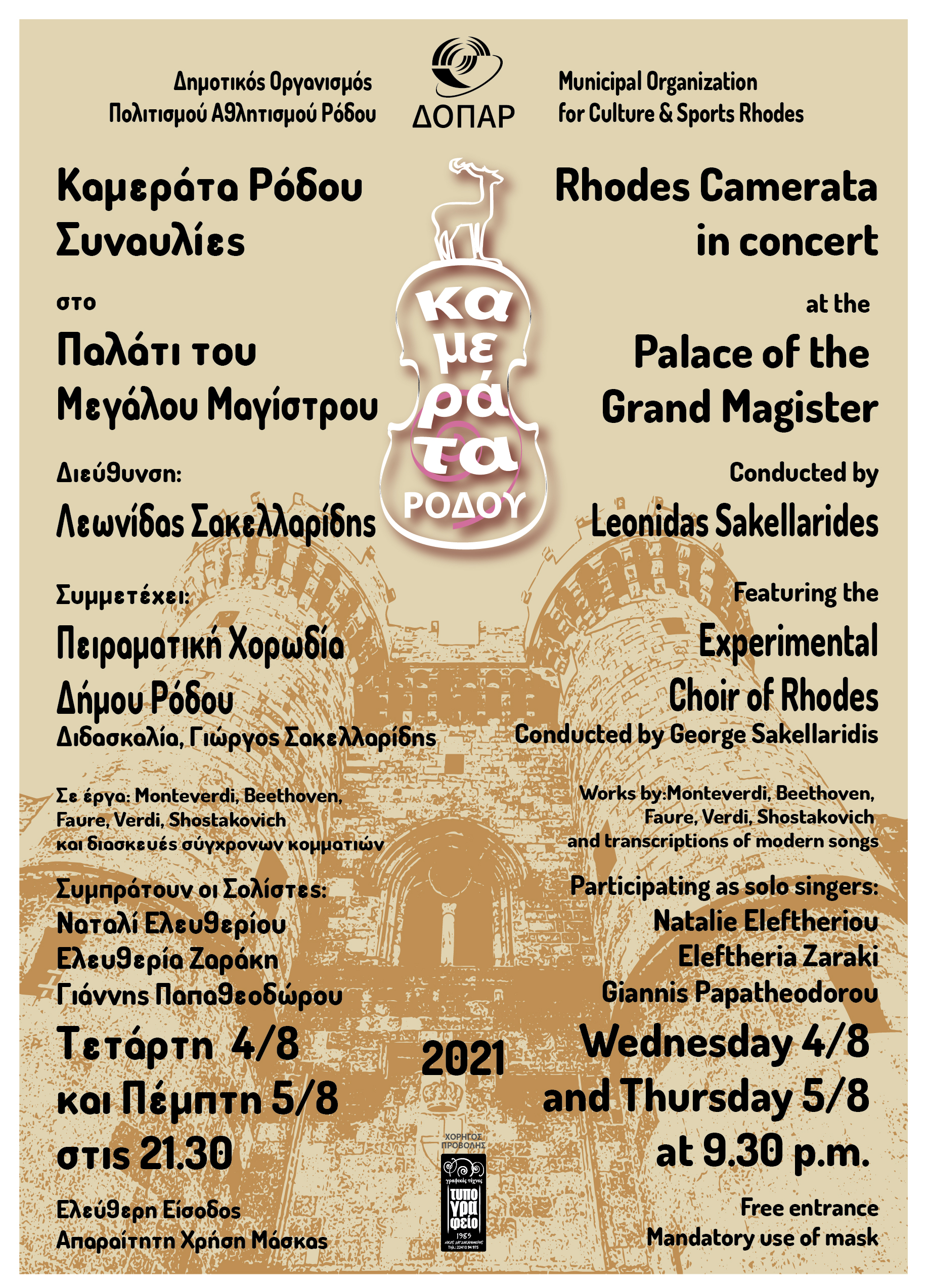 ΔΕΛΤΙΟ ΤΥΠΟΥ-Ο ΔΟΠΑΡ διοργανώνει δύο συναυλίες με την ΚΑΜΕΡΑΤΑ ΡΟΔΟΥ, υπό τη διεύθυνση του Λεωνίδα Σακελλαρίδη, την Τετάρτη 4/8 και την Πέμπτη 5/8 του 2021 στο Παλάτι του Μεγάλου Μαγίστρου. Το 33μελές ορχηστρικό σχήμα θα ερμηνεύσει έργα: Monteverdi, Verdi, Faure, Beethoven, Shostakovich, καθώς και διασκευές σύγχρονων τραγουδιών με παρουσία ΡΟΚ μπάντας. Συμπράττει η Πειραματική Χορωδία του Δήμου Ρόδου, σε διδασκαλία Γιώργου Σακελλαρίδη.  Συμμετέχουν οι σολίστ τραγουδιού: Ναταλί Ελευθερίου, Ελευθερία Ζαράκη και Γιάννης Παπαθεοδώρου. Ώρα έναρξης των συναυλιών 9.30 μ.μ. Είσοδος ελεύθερη με υποχρεωτική χρήση μάσκας. Ευχαριστούμε την Εφορεία Αρχαιοτήτων Δωδεκανήσου για την παραχώρηση του χώρου.
