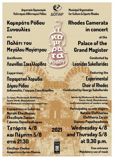 Rhodes Municipal Organization of Culture and sports organizes two concerts with RHODES CAMERATA ORCHESTRA, directed by Leonidas Sakellarides, on Wednesday 4th of August and Thursday 5th of August 2021 at the Palace of the Grand Magister in the old town of Rhodes. The 33 member Chamber Symphonic Orchestra will perform works by Monteverdi, Verdi, Faure, Beethoven, Shostakovich, as well as adaptations of modern songs, featuring a live on stage Rock band. Rhodes Camerata will be collaborating with the Experimental Choir of Rhodes (directed by George Sakellaridis) for these concerts. Also participating, the Rhodian singer soloists: Natalie Efthymiou, Eleftheria Zaraki and GIannis Papatheodorou. The concerts will begin at 9.30 p.m. The use of mask in mandatory. Free entrence. We wish to thank the Ephorate of Antiquities of Dodecanese for allowing the use of the Palace as the concert venue.
