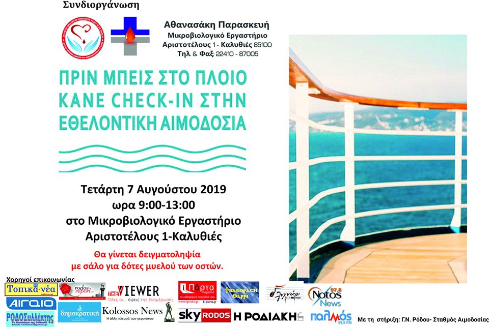 Ο Σύλλογος Εθελοντών Αιμοδοτών Ρόδου Άγιος Εφραίμ, σε συνεργασία με το Μικροβιολογικό Εργαστήριο της Παρασκευής Αθανασάκη και με την στήριξη της Ν.Υ. Αιμοδοσίας Γ.Ν. Ρόδου, διοργανώνουν εθελοντική αιμοδοσία την Τετάρτη 7 Αυγούστου 2019, από τις 9:00 έως 13:00, στις Καλυθιές (Αριστοτέλους 1).