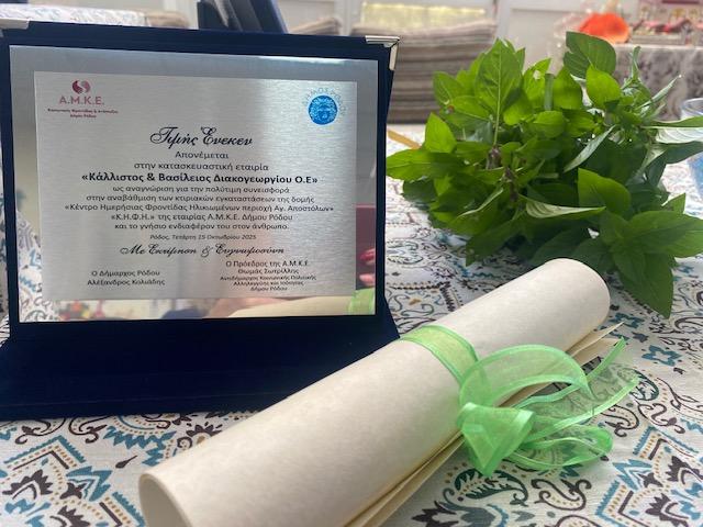 - Στην εκδήλωση βραβεύτηκε η εταιρία «Κάλλιστος και Βασίλης Διακογεωργίου Ο.Ε» που αφιλοκερδώς ανέλαβε την πλήρη ανακαίνιση των εγκαταστάσεων του κέντρου