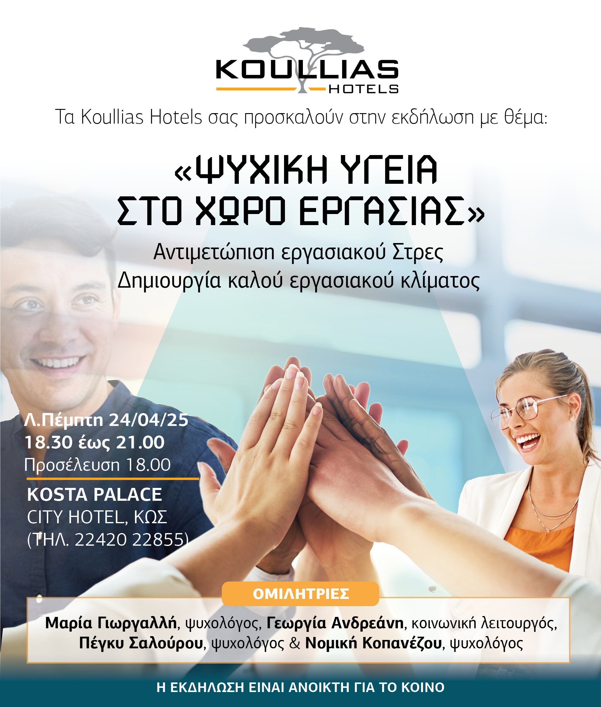 ΘΕΜΑ: Εκδήλωση με θέμα την «Ψυχική Υγεία στο Χώρο Εργασίας», οργανώνουν τα Koullias Hotels, στις 24 Απριλίου, στο Kosta Palace City Hotel, στην Κω