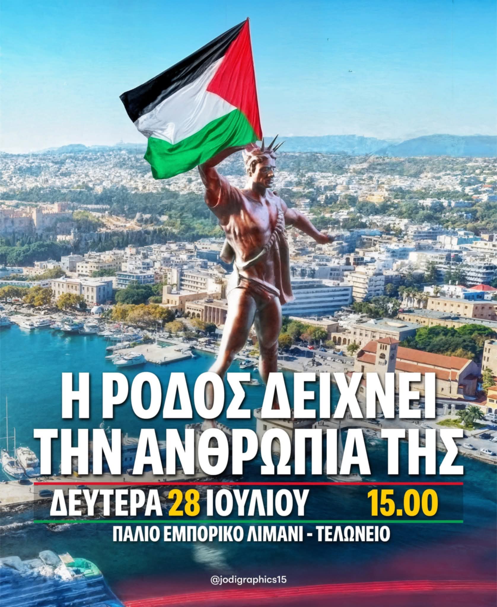 Ο Σύλλογος Υπαλλήλων του Δήμου Ροδίων καλεί τα μέλη του, αλλά και όσους/ες αρνούνται να συμβιβαστούν με την ιδέα της σφαγής αμάχων, της εξόντωσής τους με επιβαλλόμενο λιμό, με τη συστηματική γενοκτονία, αλλά ταυτόχρονα επιδιώκουν δίκαιη και βιώσιμη λύση στο Παλαιστινιακό, να συγκεντρωθούμε στο παλιό εμπορικό λιμάνι – τελωνείο στις 15:00 τη Δευτέρα 28 Ιουλίου.