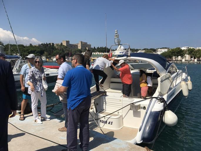 Οι κυρίες των υπουργών και των αξιωματούχων των χωρών της Διάσκεψης, με επικεφαλής τη σύζυγο του Δημάρχου Ρόδου κα Αγάπη Χατζηδιάκου και συνοδευόμενες από την αντιδήμαρχο Τουρισμού, Διεθνούς Προβολής και Δημοσίων Σχέσεων κα Μαρίζα Χατζηλαζάρου, τη Διευθύντρια του προσωπικού γραφείου του Έλληνα Υπουργού Εξωτερικών κα Χριστίνα Βαγενά, τη διευθύντρια της Διεύθυνσης Τουρισμού κα Βεατρίκη Σέρβου, την προϊσταμένη του Τμήματος Στρατηγικού Σχεδιασμού και Ανάπτυξης Τουρισμού κα Ειρήνη Χατζηνικολάου, αλλά και την προϊσταμένη του Γραφείου Επικοινωνίας, Δημοσίων και Διεθνών Σχέσεων του Δήμου Ρόδου κα Μαρία Καραμπίνη, ξεκίνησαν το πρωί τη θαλάσσια βόλτα τους ανατολικά της Ρόδου, με σκάφος που έθεσε στη διάθεση τους ο Ροδίτης επιχειρηματίας κ. Νίκος Καλαφατάς, με τελικό προορισμό τη Λίνδο.