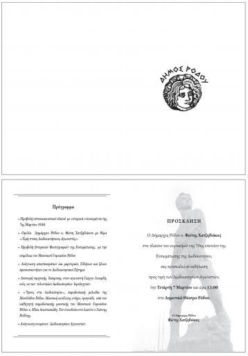 Δελτίο Τύπου-Θέμα: Εορταστική εκδήλωση του Δήμου Ρόδου, για την επέτειο των 70 χρόνων της ενσωμάτωσης με την Ελλάδα. -Στο πλαίσιο του εορτασμού της επετείου των 70 χρόνων από την Ενσωμάτωση της Δωδεκανήσου με την Ελλάδα, ο Δήμος Ρόδου διοργανώνει εκδήλωση την Τετάρτη 7 Μαρτίου και ώρα 13.00 στο Δημοτικό Θέατρο. Η εκδήλωση είναι αφιερωμένη στους Δωδεκανήσιους που πολέμησαν με κάθε τρόπο τους κατακτητές ,στους αγωνιστές της Εθνικής Αντίστασης, στους κρατούμενους στο Κοντσεντραμέντο, στους πολεμιστές και στους νεκρούς του Αλβανικού Μετώπου, στους αγωνιστές του Συντάγματος Δωδεκανησίων Εθελοντών και του Ιερού Λόχου, στους πολεμιστές του Ρίμινι και Ελ Αλαμέιν ,στους κρατούμενους στις ιταλικές και γερμανικές φυλακές και στους εκτελεσθέντες από τις κατοχικές δυνάμεις. Ο Δήμος Ρόδου καλεί τους επιζώντες και τους συγγενείς όλων των Δωδεκανησίων αγωνιστών όπως παρευρεθούν στην εκδήλωση στο Δημοτικό Θέατρο. Σύμφωνα με το πρόγραμμα ,η εκδήλωση θ΄αρχίσει με την προβολή οπτικοακουστικού υλικού με ιστορικά ντοκουμέντα της 7ης Μαρτίου 1948 και θ΄ακολουθήσει ομιλία του δημάρχου Ρόδου κ. Φώτη Χατζηδιάκου με θέμα «Τιμή στους Δωδεκανήσιους Αγωνιστές.» Στη συνέχεια θα γίνει προβολή ιστορικών φωτογραφιών της Ενσωμάτωσης με την επιμέλεια του Μουσικού Γυμνασίου Ρόδου και ανάγνωση αποσπασμάτων και μαρτυριών Ελλήνων και ξένων προσωπικοτήτων για το δωδεκανησιακό ζήτημα. Με την ευκαιρία της επετείου ο Δήμος Ρόδου θα απονείμει τιμητική διάκριση στον αγωνιστή Γιώργο Λιναρδή ενός εκ των τελευταίων Δωδεκανησίων Ιερολοχιτών και θ΄ακολουθήσει η παραδοσιακή μελωδία της Μονολίθου Ρόδου «Ύμνος στα Δωδεκάνησα» με μουσική εκτέλεση ,στίχους και τραγούδι από τον καθηγητή παραδοσιακής μουσικής του Μουσικού Γυμνασίου Ρόδου Ηλία Αναστασιάδη, συνοδεία του Γιάννη Ροδίτη στο λαούτο. Η εκδήλωση θα ολοκληρωθεί με την ανάγνωση ονομάτων Δωδεκανησίων Αγωνιστών.