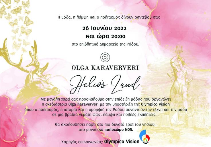 Η γνωστή σχεδιάστρια θεωρώντας ότι η περαιτέρω προώθηση της οικονομικής ανάπτυξης του νησιού , μέσω της μόδας, θα αποτελούσε σημαντικό βήμα για την επίτευξη του στόχου αυτού, θα παρουσιάσει στην Πλατεία Δημαρχείου, μπροστά από την είσοδο του Δημαρχιακού Μεγάρου, την Κυριακή 26 Ιουνίου, στις 8 το βράδυ τη νέα συλλογή του οίκου #olgakaraververis.