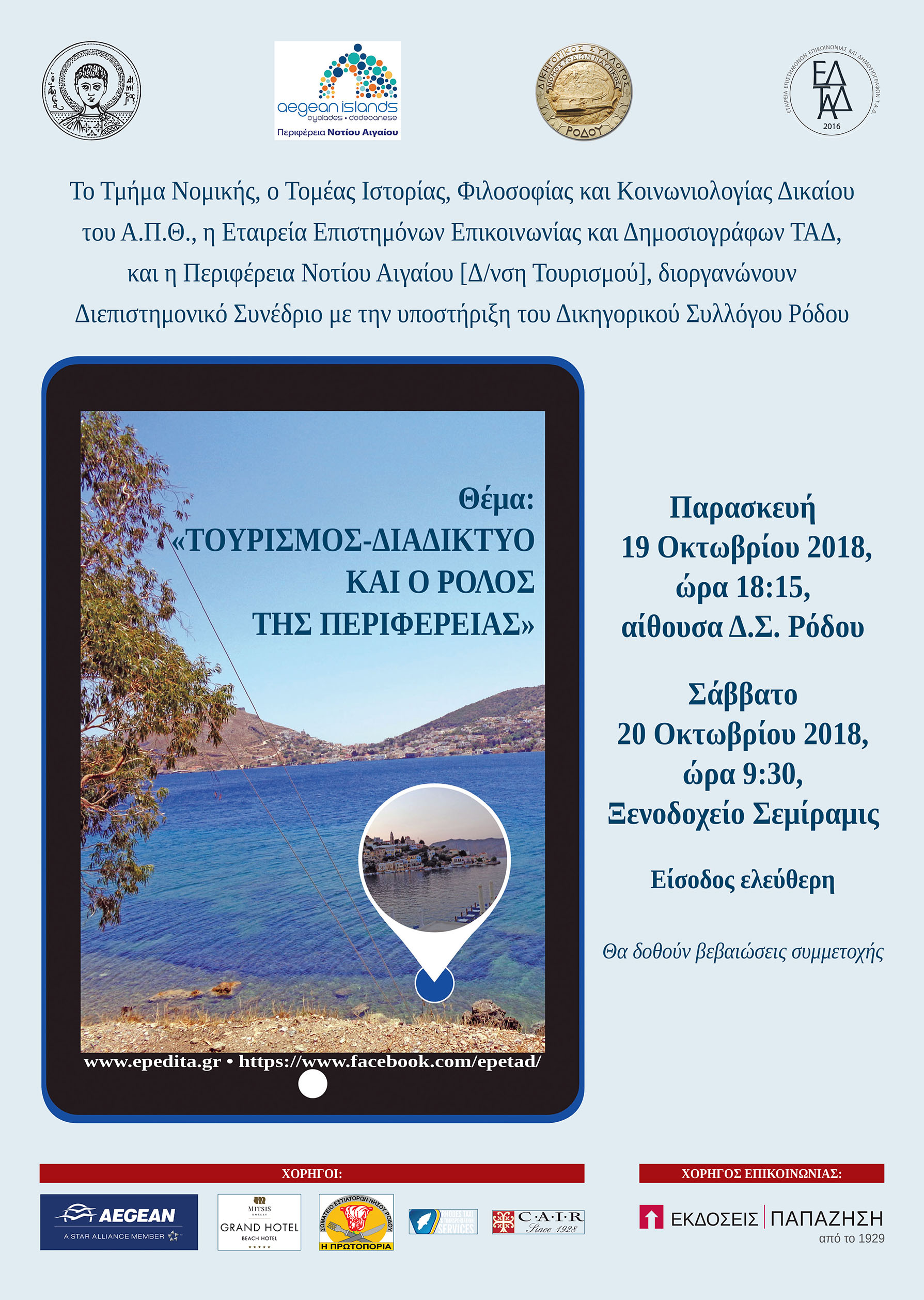ΔΕΛΤΙΟ ΤΥΠΟΥ-Επιστημονικό Συνέδριο «ΤΟΥΡΙΣΜΟΣ-ΔΙΑΔΙΚΤΥΟ ΚΑΙ Ο ΡΟΛΟΣ ΤΗΣ ΠΕΡΙΦΕΡΕΙΑΣ» -Παρασκευή 19 Οκτωβρίου 2018 και Σάββατο 20 Οκτωβρίου 2018, Ρόδος -Με σκοπό να αναδειχθεί ο πολυδιάστατος ρόλος του Διαδικτύου στον Τουρισμό και να ενημερωθούν για τις νομοθετικές εξελίξεις οι εμπλεκόμενοι επαγγελματίες, το Τμήμα Νομικής, ο Τομέας Ιστορίας, Φιλοσοφίας και Κοινωνιολογίας Δικαίου του Α.Π.Θ., η Εταιρεία Επιστημόνων Επικοινωνίας και Δημοσιογράφων ΤΑΔ, με συνδιοργανωτή την Περιφέρεια Νοτίου Αιγαίου [Δ/νση Τουρισμού Δωδεκανήσου], διοργανώνουν Επιστημονικό Συνέδριο με την υποστήριξη του Δικηγορικού Συλλόγου Ρόδου την Παρασκευή 19 Οκτωβρίου και το Σάββατο 20 Οκτωβρίου 2018 στη Ρόδο με θέμα: «ΤΟΥΡΙΣΜΟΣ-ΔΙΑΔΙΚΤΥΟ ΚΑΙ Ο ΡΟΛΟΣ ΤΗΣ ΠΕΡΙΦΕΡΕΙΑΣ».