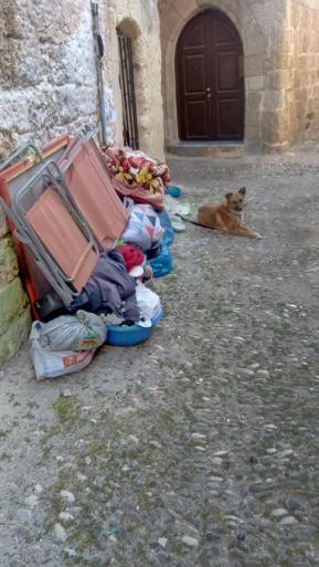 Στην φωτο βλέπουμε το.... ..νοικοκυριό ενός κλοσάρ της πόλης παρατημένο σ'ενα σοκάκι της Μεσαιωνικής πόλης σαν ατραξιόν και καλωσόρισμα της τουριστικής σεζόν που άνοιξε αυλαία πριν λίγες μέρες και δίπλα τον πιστό τετράποδο ... κλοσάρ φίλο του να το φυλάει.