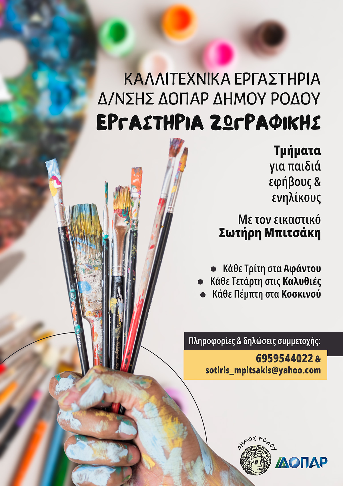 Η Διεύθυνση ΔΟΠΑΡ Δήμου Ρόδου πραγματοποιεί Εργαστήρια Ζωγραφικής σε Αφάντου, Καλυθιές και Κοσκινού για παιδιά νηπιαγωγείου, δημοτικού, εφήβους και ενηλίκους με τον εικαστικό Σωτήρη Μπιτσάκη.