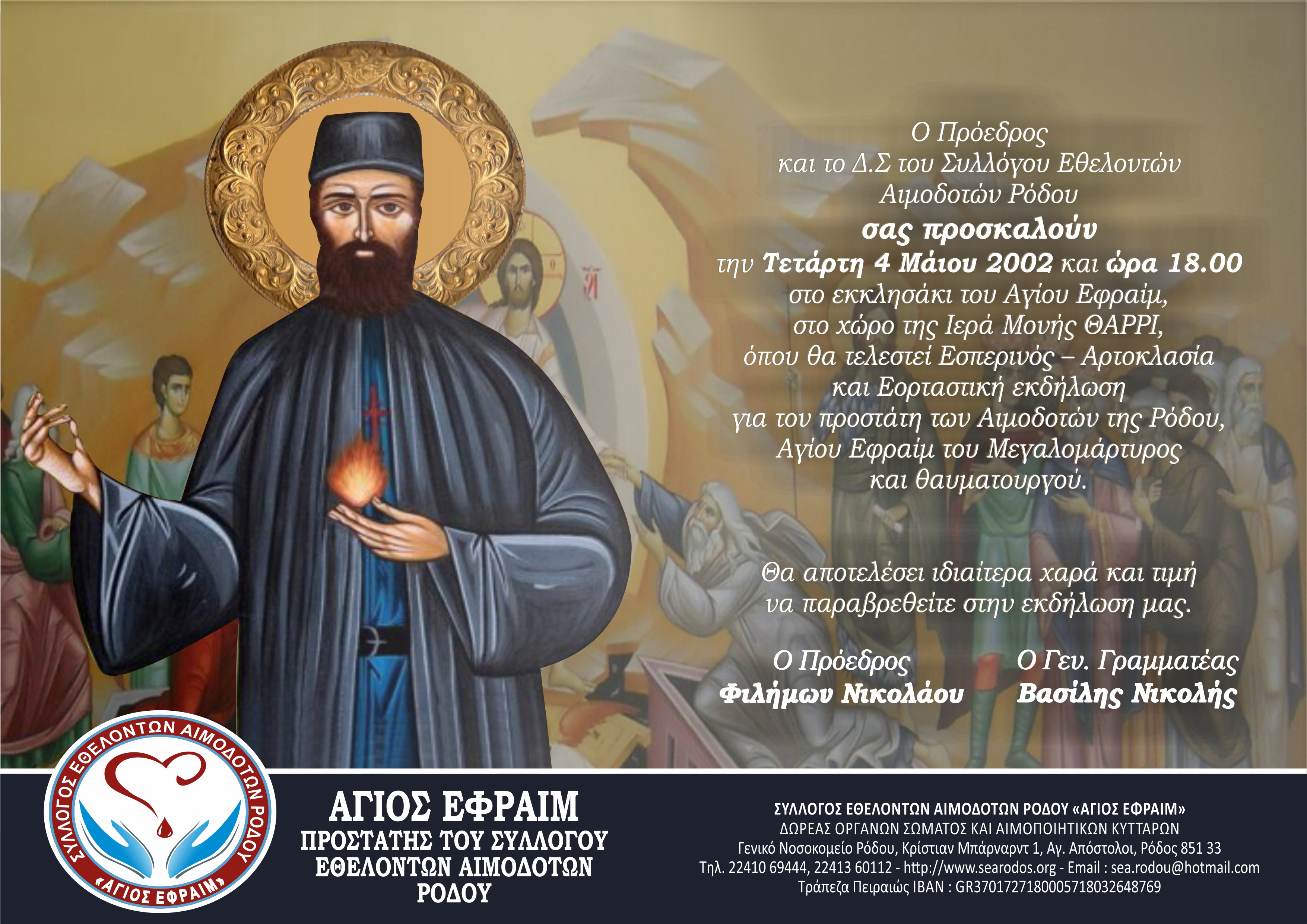 Ο Πρόεδρος και το Δ.Σ του Συλλόγου Εθελοντών Αιμοδοτών Ρόδου σας προσκαλούν την Τετάρτη 4 Μάιου 2002 και ώρα 18.00 στο εκκλησάκι του Αγίου Εφραίμ, στο χώρο της Ιερά Μονής ΘΑΡΡΙ, όπου θα τελεστεί Εσπερινός – Αρτοκλασία και Εορταστική εκδήλωση για τον προστάτη των αιμοδοτών της Ρόδου, Άγιο Εφραίμ.
