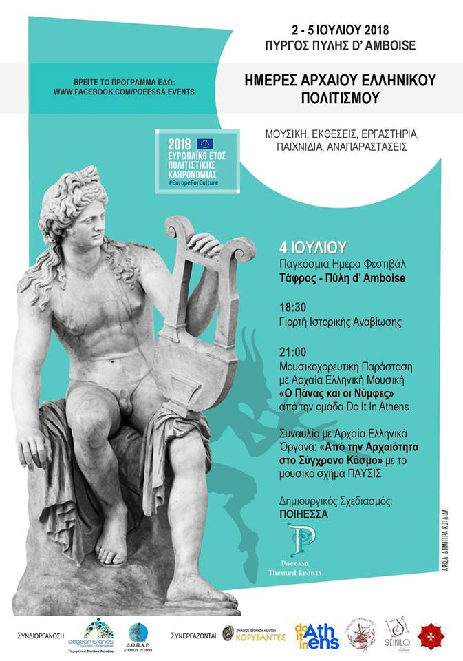 ΔΕΛΤΙΟ ΤΥΠΟΥ ΗΜΕΡΕΣ ΑΡΧΑΙΟΥ ΕΛΛΗΝΙΚΟΥ ΠΟΛΙΤΙΣΜΟΥ, 2 έως 5 ΙΟΥΛΙΟΥ με το Σήμα της Επιτροπής του Υπουργείου Πολιτισμού Για πρώτη φορά στον τόπο μας, διοργανώνεται φεστιβάλ αφιερωμένο στον Αρχαίο Ελληνικό Πολιτισμό, στις 2-5 Ιουλίου, στην Πύλη d’ Amboise και μάλιστα με τη συνεργασία πολιτιστικών ομάδων από 3 πόλεις της Ελλάδας: Ρόδο – Αθήνα – Θεσσαλονίκη. Στο φεστιβάλ, που φέρει τον τίτλο «Ημέρες Αρχαίου Ελληνικού Πολιτισμού», απονεμήθηκε ήδη το σήμα του «Έτους Ευρωπαϊκής Πολιτιστικής Κληρονομιάς 2018» και συνδιοργανώνεται από το Τμήμα Πολιτισμού Δωδ/σου της Περιφέρειας Ν. Αιγαίου και το ΔΟΠΑΡ, με τη συνεργασία του Συλλόγου Ιστορικών Μελετών «Κορύβαντες» σε πρωτοβουλία και σχεδιασμό της «Ποιήεσσα» και με τη συμμετοχή των πολιτιστικών ομάδων ΣΕΙΚΙΛΟΣ και DO IT IN ATHENS, αναγνωρίζοντας την προσφορά αυτής της διοργάνωσης στην πολιτιστική κληρονομιά του τόπου αλλά και της Ευρώπης. Η Ευρωπαϊκή Ένωση έχει θεσπίσει αυτό το σήμα χαρακτηρίζοντας το 2018 ως Ευρωπαϊκό έτος Πολιτιστικής Κληρονομιάς (ΕΕΠΚ 2018) και απονέμεται κατόπιν ελέγχου και αξιολόγησης της ελεγκτικής επιτροπής της Ομάδας Εργασίας του ΕΕΠΚ 2018 του Υπουργείου Πολιτισμού & Αθλητισμού. Το Ευρωπαϊκό έτος Πολιτιστικής Κληρονομιάς περιλαμβάνει πρωτοβουλίες και εκδηλώσεις σε ευρωπαϊκό, εθνικό, περιφερειακό και τοπικό επίπεδο και καθώς η πολιτιστική κληρονομιά της Αρχαίας Ελλάδας είναι ένα αγαθό που μας διαμορφώνει και ανήκει σε όλους μας, δε θα μπορούσε να λείπει ένα τέτοιο πολιτιστικό γεγονός από την πολύ-πολιτισμική Ρόδο. Στο πλαίσιο των εκδηλώσεων της διοργάνωσης θα παρουσιαστούν: Ζωντανή μουσική με αρχαία Ελληνικά Όργανα Χορογραφίες εμπνευσμένες από την Αρχαία Ελλάδα Εργαστήρια και τουρνουά αρχαίων επιτραπέζιων παιχνιδιών Δωρεάν Εργαστήρια* αρχαίας λύρας και κρουστών Αρχαία ελληνική σπαθασκία και Τοξοβολία Αρχαία Τοξοβολία Παρουσίαση Αρχαίας Ελλ. Κουζίνας Επίδειξη Αρχαίου Ελλ. μακιγιάζ Σεμινάρια - Ομιλίες και Εκθέσεις