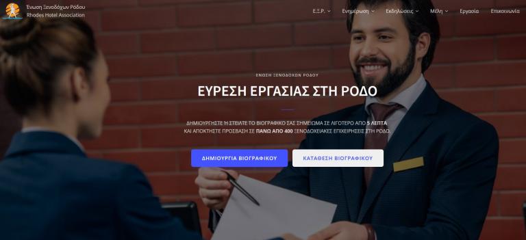 - Η Ένωση Ξενοδόχων Ρόδου θέτει σε λειτουργία την πρώτη πλατφόρμα Εύρεσης Εργασίας στα Ξενοδοχεία της Ρόδου, για επαγγελματίες ή μη, όπου ο ενδιαφερόμενος καταθέτοντας το βιογραφικό του σε λιγότερο από 5 λεπτά, αποκτά αυτόματα πρόσβαση σε περισσότερα από 400 ξενοδοχεία και 4.000+ νέες θέσεις εργασίας.