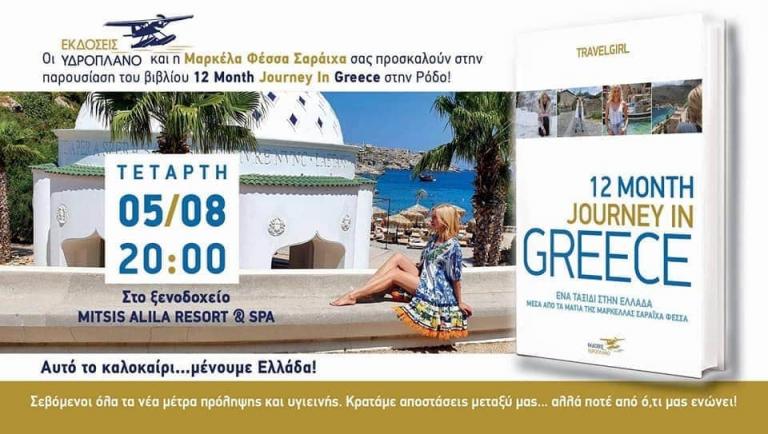 - Την Τετάρτη, 5 Αυγούστου, η γνωστή δημοσιογράφος Μαρκέλλα Σαράιχα Φέσσα θα παρουσιάσει στη Ρόδο το πρώτο της βιβλίο, 12 Month Journey In Greece που κυκλοφορεί από τις Εκδόσεις Υδροπλάνο. Η παρουσίαση θα γίνει στο ξενοδοχείο Mitsis Alila Resort & Spa στις 20.00.