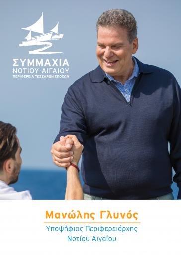ΟΜΙΛΙΑ-ΔΙΑΚΗΡΥΞΗ ΤΟΥ ΕΠΙΚΕΦΑΛΗΣ ΤΗΣ ΠΑΡΑΤΑΞΗΣ “ΣΥΜΜΑΧΙΑ ΝΟΤΙΟΥ ΑΙΓΑΙΟΥ” ΠΕΡΙΦΕΡΕΙΑ ΤΕΣΣΑΡΩΝ ΕΠΟΧΩΝ ΜΑΝΩΛΗ ΓΛΥΝΟΥ -ΑΛΛΑΖΟΥΜΕ ΤΟ ΝΟΤΙΟ ΑΙΓΑΙΟ ΑΠΟ ΠΕΡΙΦΕΡΕΙΑ ΧΕΙΜΕΡΙΑΣ ΝΑΡΚΗΣ ΣΕ ΠΕΡΙΦΕΡΕΙΑ ΤΕΣΣΑΡΩΝ ΕΠΟΧΩΝ -Ευχαριστώ τα ΜΜΕ για την ανταπόκριση τα Μ.Μ.Ε. για την παρουσία τους kαι τους φίλους που αυθόρμητα είχαν τη διάθεση να μας τιμήσουν. Φίλες και Φίλοι, Σήμερα θέλω να σας μιλήσω για τον τόπο μας, για το τόπο που κατοικούμε και ζούμε, για τον τόπο που αγαπάμε, για τον τόπο που μας ενώνει. Για τις Κυκλάδες και τα Δωδεκάνησα. Για το Νότιο Αιγαίο μας. Γιαυτό είμαι εδώ σήμερα και σας μιλάω. Γιατί υπάρχει η έννοια της συνέχειας. Γιατί η ιδιαιτερότητα των τόπων προσδιορίζει τους ανθρώπους τις σχέσεις τους, τις αγωνίες τους και τα όνειρά τους. Είμαστε νησιώτες. Είμαστε περήφανοι για αυτό. Κάθε άνθρωπος αγαπά τον τόπο του. Μέσα στο σκληρό πυρήνα της προσωπικότητάς, του διακρίνει έντονα την επιρροή του τόπου που έχει μεγαλώσει και ζει. Εντοπίζει τα θετικά αλλά και τα αρνητικά χαρακτηριστικά που κληρονομεί από το περιβάλλον του. Είμαστε άνθρωποι ονειροπόλοι, ρομαντικοί, αλλά και ταυτόχρονα ρεαλιστές και μεθοδικοί. Ακούγεται παράδοξο; Δεν γίνεται αλλιώς όταν ο τόπος σου ήταν πάντοτε όμορφος αλλά και δύσκολος. Και για αυτό είμαστε περήφανοι που είμαστε νησιώτες, που είμαστε Δωδεκανήσιοι και Κυκλαδίτες. Θέλω να μοιραστώ το όραμά μου μαζί σας αλλά κυρίως θέλω να ακούσω εσάς. Να ακούσω τους προβληματισμούς σας, τις σκέψεις σας, αυτά που αντιμετωπίζετε στην καθημερινότητά σας και δεν έχετε βρει κάποιον να τα μοιραστείτε. Στη πολιτική μου πορεία έτσι έχω μάθει να δρω. Έχοντας ως αδιαπραγμάτευτη αρχή τη διαφάνεια, την εντιμότητα και την έννοια του δημοσίου συμφέροντος, άκουγα και δρούσα με γνώμονα το κοινό καλό. Ένα πρωινό με σταμάτησε ένας καλός φίλος στη Ρόδο και με ρώτησε «Βρε Μανώλη, τι θες να μπλέξεις με αυτούς, γιατί δεν κάθεσαι στο ιατρείο σου, στην οικογένειά σου;». Η απάντηση είναι εξαιρετικά απλή. Του την είπα, την μοιράζομαι και μαζί σας. Γιατί νιώθω την ανάγκη να βοηθήσω να αλλάξει ο τόπος που αγαπώ. Γιατί το νιώθω ως χρέος απέναντι σε εσάς, απέναντι σε κάθε έναν κάτοικο του Νοτίου Αιγαίου ανεξαρτήτως ηλικίας, περιοχής ή κομματικής προέλευσης. Η πορεία μου στα κοινά είναι γνωστή. Υπηρέτησα στην τοπική αυτοδιοίκηση Α’ βαθμού για αρκετά χρόνια ανταποκρινόμενος με σεβασμό στην τιμή που μου έκαναν οι συμπολίτες μου στη Ρόδο. Από τις θέσεις που κατείχα, επεδίωξα διαχρονικά τη Συνεργασία, τη Σύνθεση και τη Συνέργεια όλων των παρατάξεων και των κοινωνικών ομάδων, έχοντας ως γνώμονα την επίλυση σημαντικών προβλημάτων. Δεν χρησιμοποίησα την πολιτική ως σκαλοπάτι για προσωπική, κοινωνική ή επαγγελματική ανέλιξη και ούτε επεδίωκα να είμαι αρεστός κόντρα στις αρχές και τις πεποιθήσεις μου. Σε εποχές που υπήρχαν αναστολές και αντιδράσεις, δεν δίστασα να θίξω ευαίσθητα ζητήματα για να εξασφαλίσω την κοινωνική συναίνεση. Γι' αυτό και οι πρωτοβουλίες ίδρυσης κοινωνικών δομών έγιναν αποδεκτές από το μεγαλύτερο μέρος της κοινωνίας, δίνοντας διέξοδο σε εκρηκτικά κοινωνικά ζητήματα. Όλοι οι συμπολίτες γνωρίζουν ότι η πολιτική ουδέποτε υπήρξε για μένα μία επαγγελματική διέξοδος, ένας αγώνας ματαιοδοξίας ή εξουσίας. Γι' αυτό, το 2014 έχοντας τιμηθεί με πρωτιά σε σταυρούς και τις πέντε φορές που ήμουν υποψήφιος δημοτικός σύμβουλος, αποφάσισα συνειδητά να αποσυρθώ