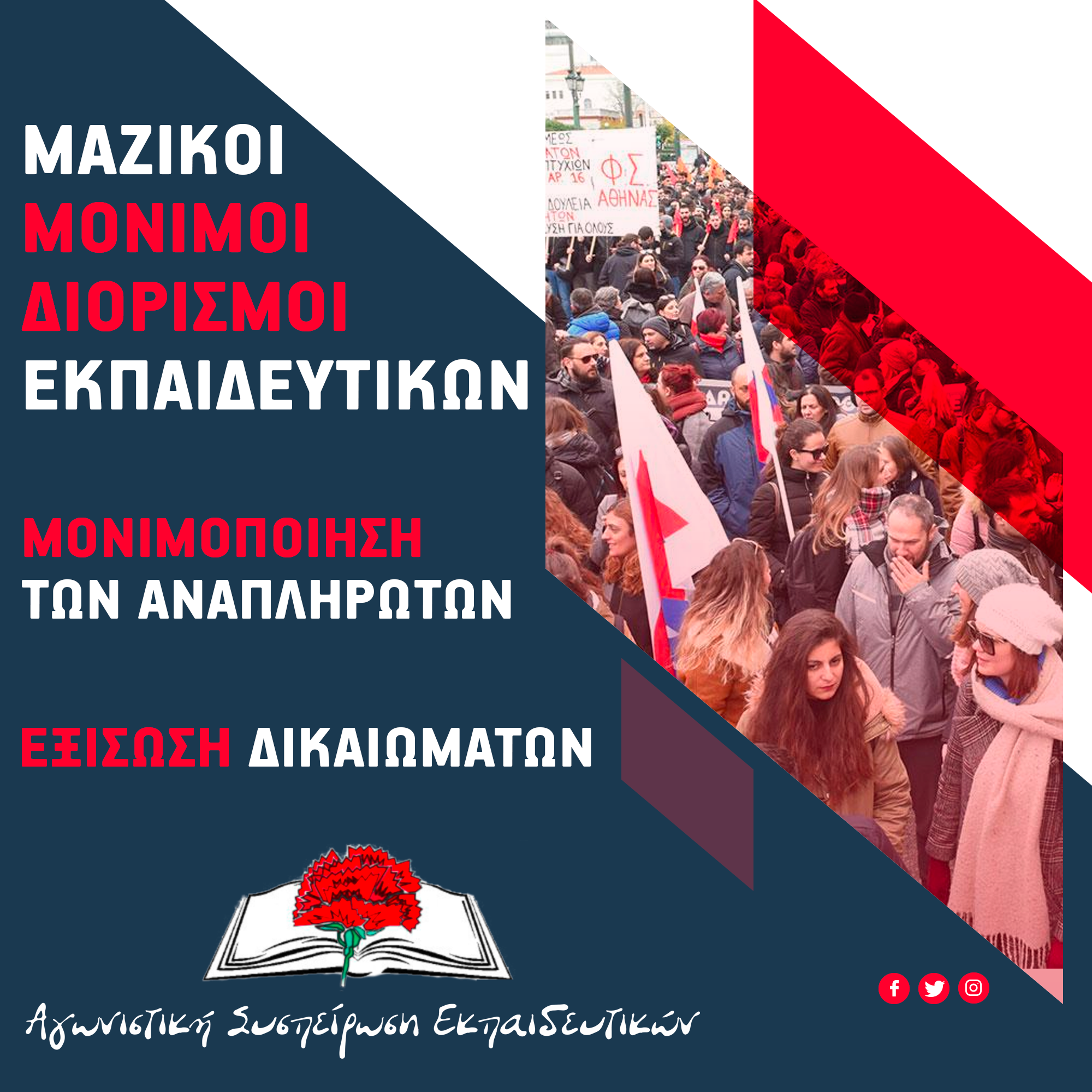 - Μόνιμη και σταθερή δουλεία. Μαζικούς – μόνιμους διορισμούς εκπαιδευτικών άμεσα, πριν την έναρξη της επόμενης σχολικής χρονιάς. Μονιμοποίηση όλων των αναπληρωτών που δουλεύουν τα τελευταία χρόνια στα σχολεία.