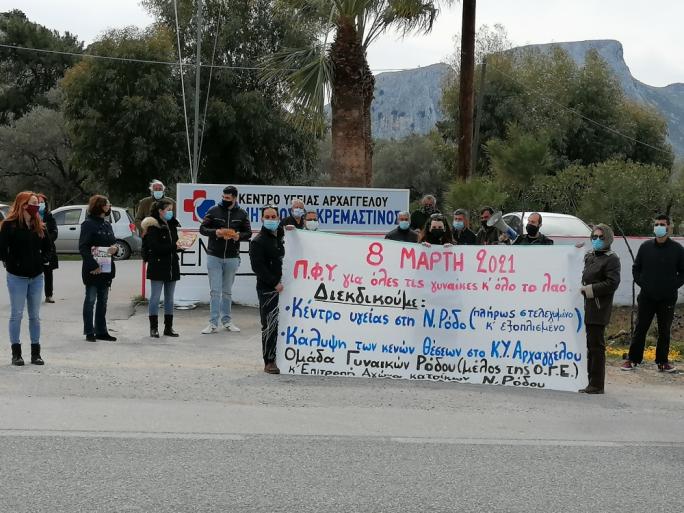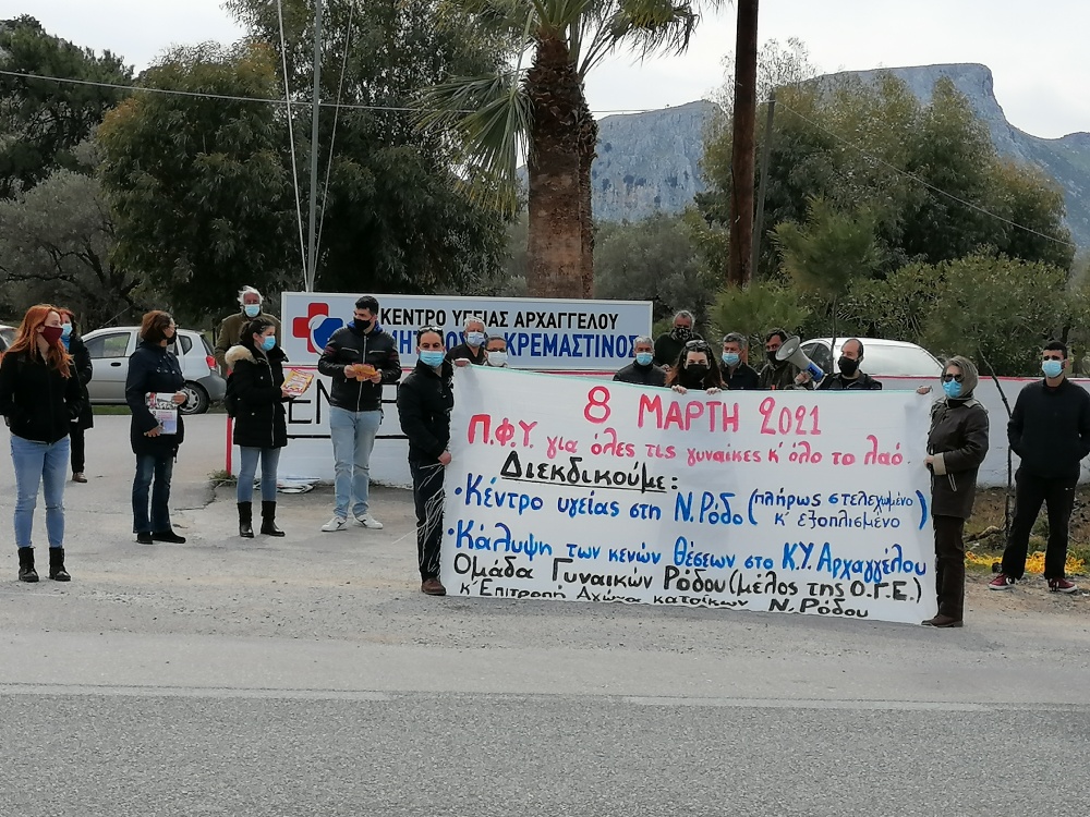 ΔΕΛΤΙΟ ΤΥΠΟΥ-Την Δευτέρα 8 Μαρτίου, παγκόσμια ημέρα της γυναίκας, πραγματοποιήσαμε μαζί με την ομάδα γυναικών Ρόδου της ΟΓΕ ,συμβολική συγκέντρωση διαμαρτυρίας μπροστά από το κέντρο υγείας Αρχαγγέλου. Τα αιτήματα της κινητοποίησης ήταν η δημιουργία κέντρου υγείας στην Νότια Ρόδο, και η ενίσχυση με το αναγκαίο προσωπικό του κέντρου υγείας Αρχαγγέλου.