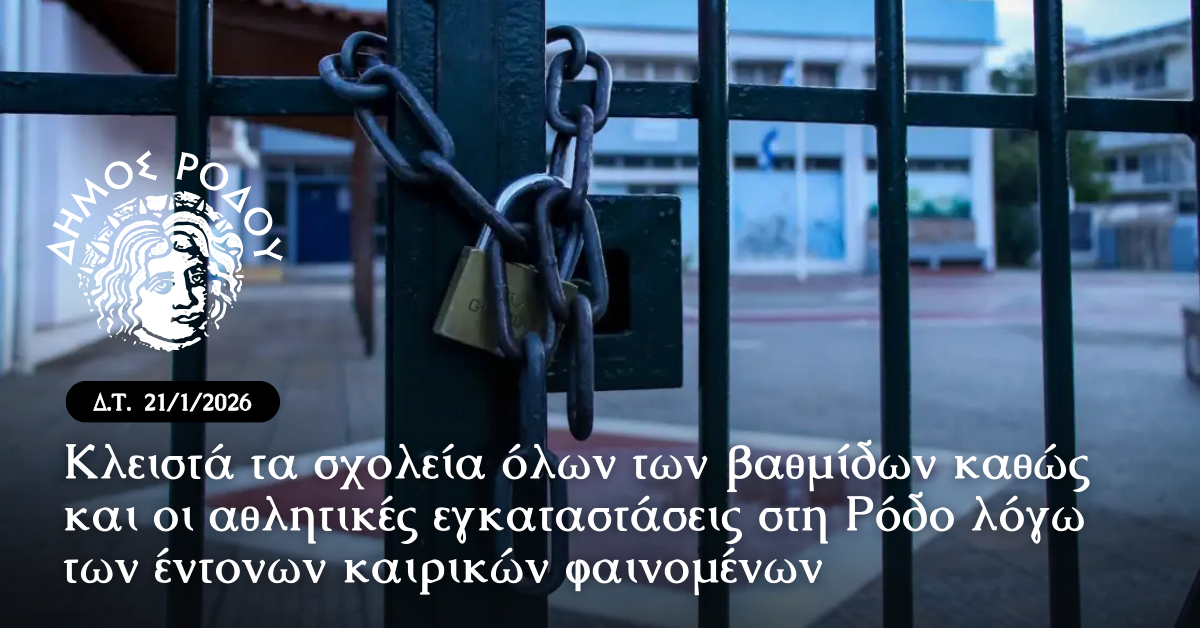 Με απόφαση του Δημάρχου Ρόδου, Αλέξανδρου Κολιάδη, οι σχολικές μονάδες όλων των βαθμίδων στο νησί θα παραμείνουν κλειστές από σήμερα Τετάρτη 21 Ιανουαρίου έως και την Πέμπτη 22 Ιανουαρίου 2026.