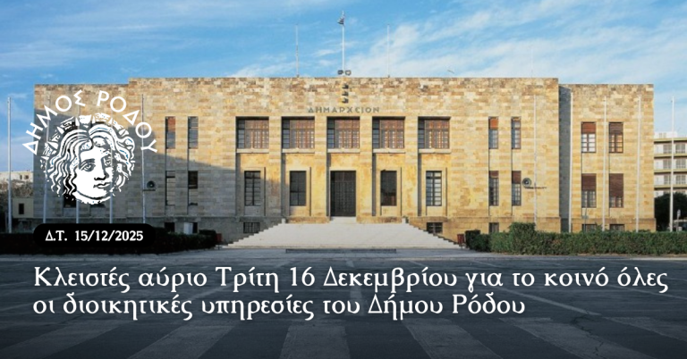 Κλειστές αύριο Τρίτη 16 Δεκεμβρίου για το κοινό όλες οι διοικητικές υπηρεσίες του Δήμου Ρόδου