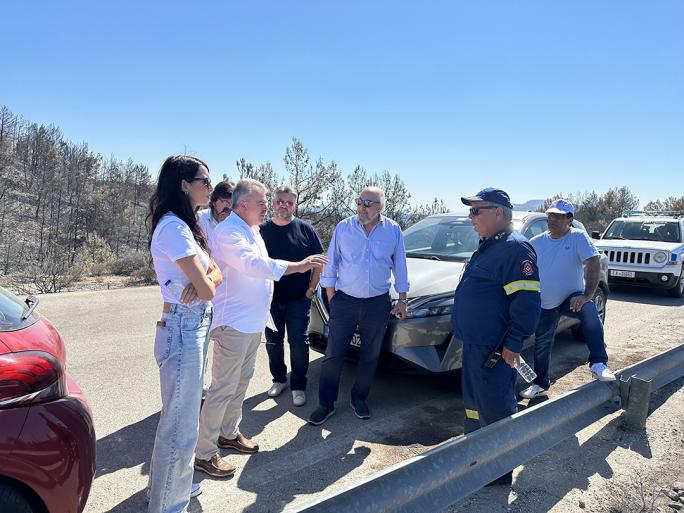 Ο βουλευτής Δωδεκανήσου υπεύθυνος του Κοινοβουλευτικού Τομέα Ανάπτυξης Γιώργος Νικητιάδης, η βουλευτής Λασιθίου και υπεύθυνη του Κοινοβουλευτικού Τομέα Τουρισμού Κατερίνα Σπυριδάκη και ο βουλευτής Αργολίδας και υπεύθυνος του Κοινοβουλευτικού Τομέα Κλιματικής Κρίσης και Πολιτικής Προστασίας Ανδρέας Πουλάς, ο υποψήφιος Περιφερειάρχης Νοτίου Αιγαίου που στηρίζεται από το ΠΑΣΟΚ Νικηφόρος Παπανικόλας και άλλα τοπικά στελέχη βρέθηκαν στις πυρόπληκτες περιοχές και ενημερώθηκαν για τις επιπτώσεις στο φυσικό περιβάλλον από τον καθηγητή Δυναμικής Τεκτονικής και Εφαρμοσμένης Γεωλογίας Ευθύμιο Λέκκα.