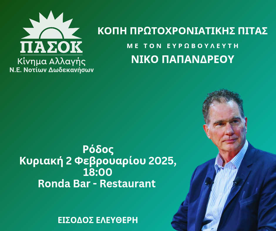 Η Νομαρχιακή Επιτροπή ΠΑΣΟΚ - Κίνημα Αλλαγής Νοτίων Δωδεκανήσων σας προσκαλεί στην καθιερωμένη κοπή πρωτοχρονιάτικης πίτας, που θα πραγματοποιηθεί την Κυριακή 2 Φεβρουαρίου 2025 και ώρα 18:00 στο RondaBarRestaurant στη Ρόδο.