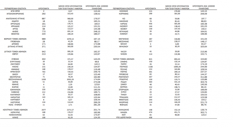 Η σημερινή ανακοίνωση του ΕΟΔΥ: «Τα νέα εργαστηριακά επιβεβαιωμένα κρούσματα της νόσου που καταγράφηκαν τις τελευταίες 24 ώρες είναι 19.772, εκ των οποίων 65 εντοπίστηκαν κατόπιν ελέγχων στις πύλες εισόδου της χώρας.