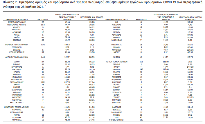 Η σημερινή ανακοίνωση του ΕΟΔΥ: Τα στοιχεία που παρουσιάζονται αφορούν περιστατικά από την επιδημιολογική επιτήρηση της νόσου από το νέο κορoνοϊό (COVID19), με βάση τα δεδομένα που έχουν δηλωθεί στον ΕΟΔΥ και καταγραφεί μέχρι τις 28 Ιουλίου 2021 (ώρα 15:00).